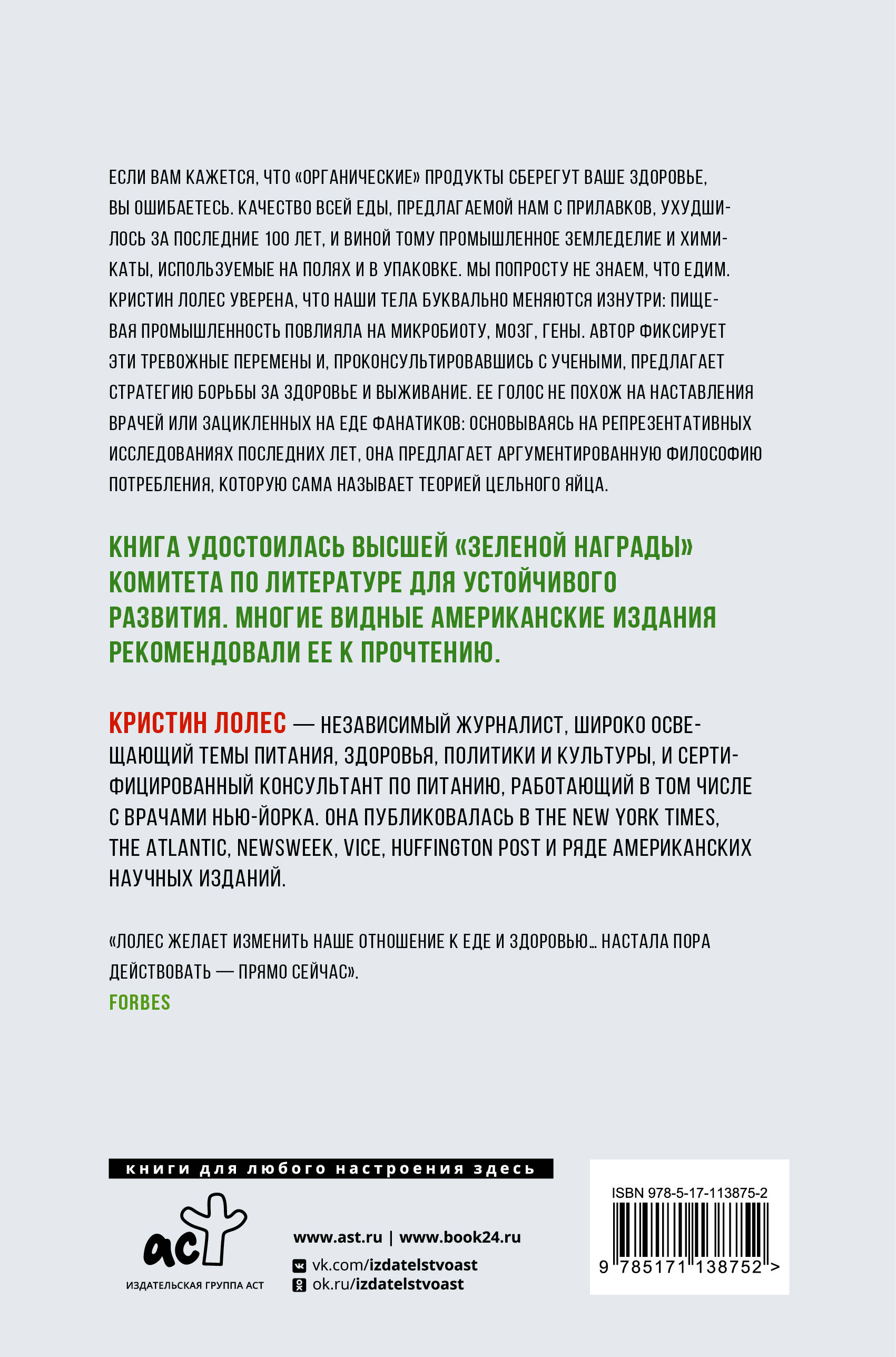 Если вам кажется, что "органические" продукты сберегут ваше здоровье, вы ошибаетесь. Качество всей еды, предлагаемой нам с прилавков, ухудшилось за последние 100 лет, и виной тому промышленное земледелие и химикаты, используемые на полях и в упаковке. Мы попросту не знаем, что едим. Кристин Лолес уверена, что наши тела буквально меняются изнутри: пищевая промышленность повлияла на микробиоту, мозг, гены. Автор фиксирует эти тревожные перемены и, проконсультировавшись с исследователями, предлагает стратегию борьбы за здоровье и выживание. Ее голос не похож на наставления врачей или зацикленных на еде фанатиков: основываясь на репрезентативных исследованиях последних лет, она предлагает аргументированную философию потребления, которую сама называет теорией цельного яйца.| Издательство | ИЗДАТЕЛЬСТВО "АСТ" |
