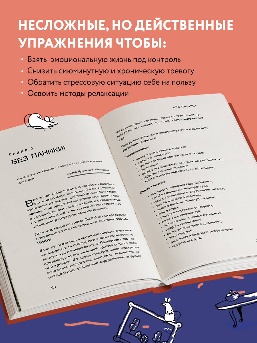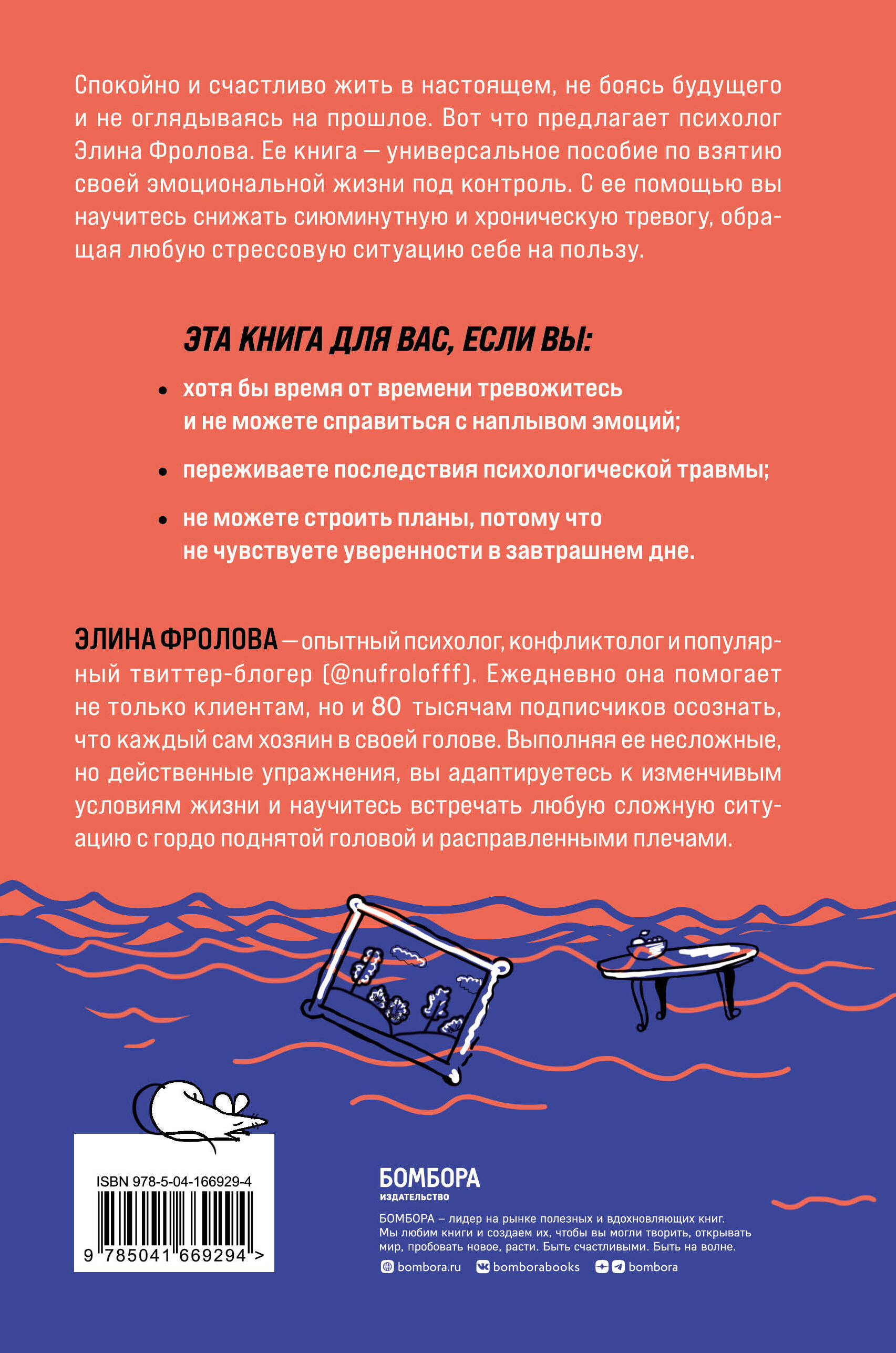 Спокойно и счастливо жить в настоящем, не боясь будущего и не оглядываясь на прошлое. Вот что предлагает психолог Элина Фролова. Ее книга - универсальное пособие по взятию своей эмоциональной жизни под контроль. С его помощью вы научитесь снижать сиюминутную и хроническую тревогу, обращая любую стрессовую ситуацию себе на пользу. Эта книга для вас, если: • вы хотя бы время от времени тревожитесь и не можете справиться с наплывом эмоций; • переживаете последствия психологической травмы; • или не можете строить планы, потому что не чувствуете уверенности в завтрашнем дне. Элина Фролова - опытный психолог, конфликтолог и популярный твиттер-блогер (@nufrolofff). Ежедневно она помогает не только клиентам, но и 80 тысячам подписчиков осознать, что каждый сам хозяин в своей голове. Выполняя ее несложные, но действенные упражнения, вы адаптируетесь к изменчивым условиям жизни и научитесь встречать любую сложную ситуацию с гордо поднятой головой и расправленными плечами.| Издательство | ООО "Издательство "Эксмо" |