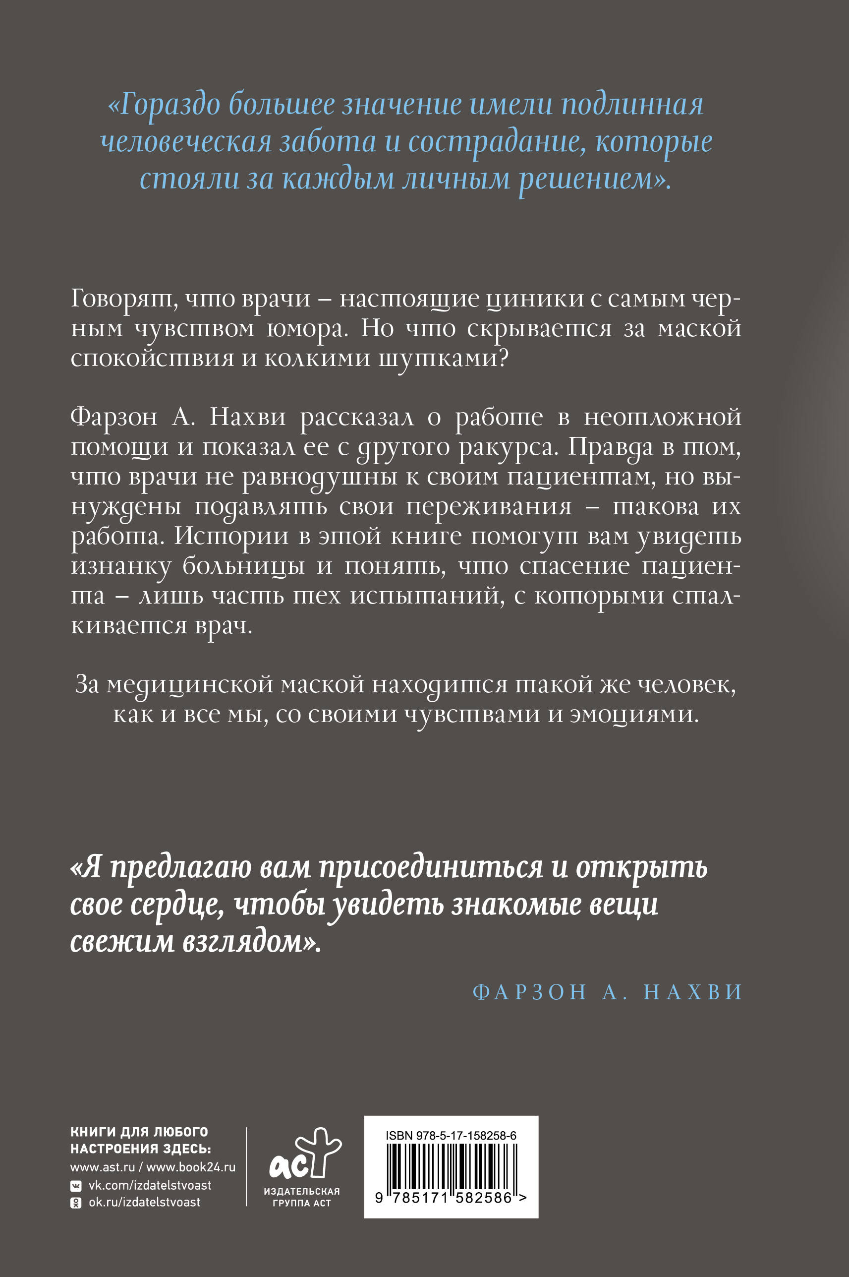 Говорят, что врачи - настоящие циники с самым черным чувством юмора. Но что скрывается за маской спокойствия и колкими шутками? Фарзон А. Нахви рассказал о работе в неотложной помощи и показал ее с другого ракурса. Правда в том, что врачи не равнодушны к своим пациентам, но вынуждены подавлять свои переживания - такова их работа. Истории в этой книге помогут вам увидеть изнанку больницы и понять, что спасение пациента - лишь часть тех испытаний, с которыми талкивается врач.