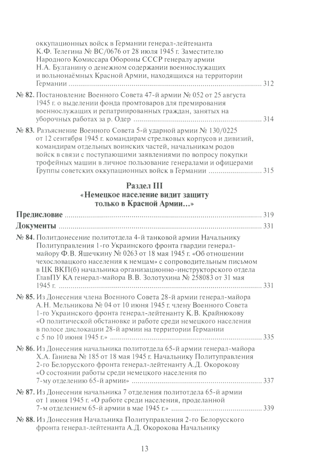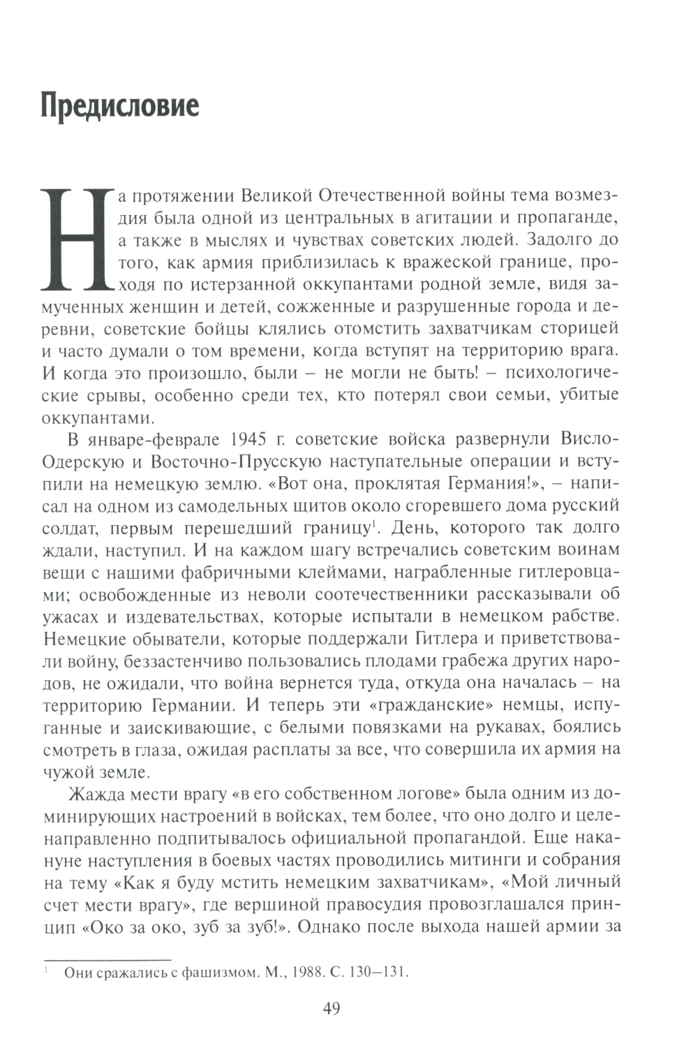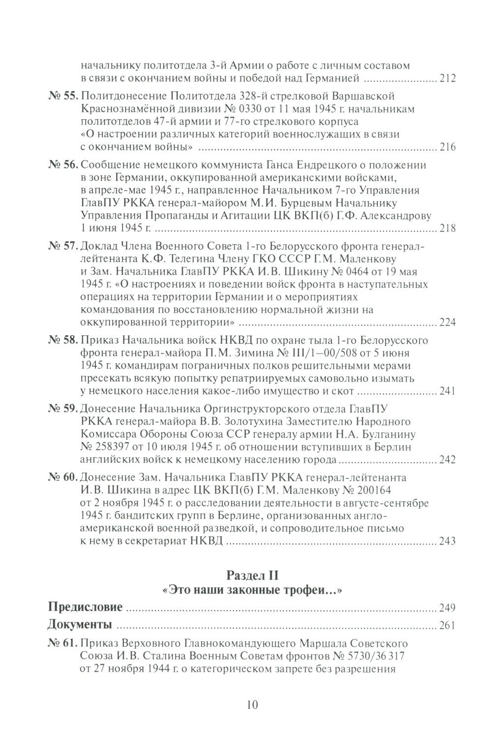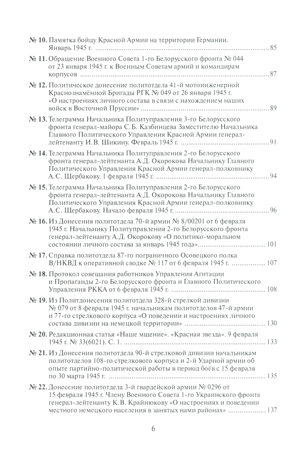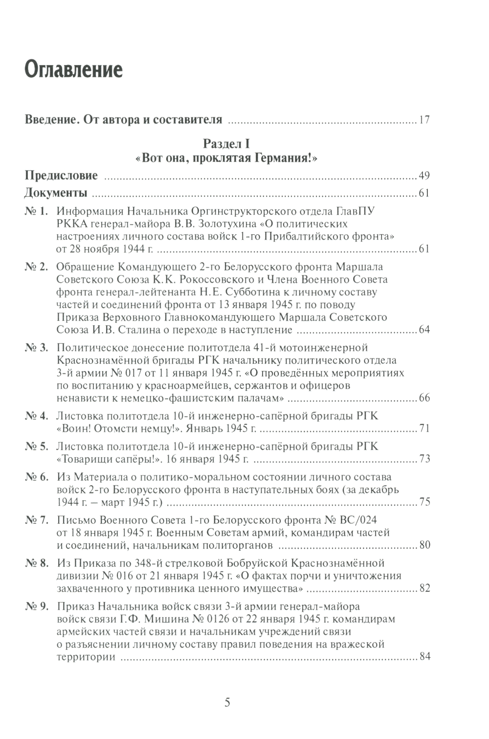 Сборник, посвященный социально-психологическим аспектам завершающего этапа Великой Отечественной войны и Освободительной миссии Красной Армии в Европе, содержит недавно рассекреченные документы и материалы из Центрального архива Министерства обороны Российской Федерации, Российского государственного военного архива, а также Государственного архива Российской Федерации и Российского государственного архива социально-политической истории. В издании рассматриваются острые дискуссионные вопросы: настроения и поведение советских военнослужащих на вражеской территории Германии и Восточной Пруссии; система организации посылок из действующей Красной Армии в тыловые районы СССР; сложные взаимоотношения между немецким гражданским населением и представителями других народов освобожденной Европы в 1945 г. Материалы данной публикации представляют не только академический интерес, но могут быть использованы в политической практике ведения современной информационно-психологической войны для противодействия антироссийской пропаганде, мифологизации и фальсификации истории, которые проводятся зарубежными политиками и СМИ в целях искажения, принижения и отрицания роли СССР в победе над фашизмом во Второй мировой войне. Также они имеют значение в важном для российского общества вопросе - сохранения объективного образа Великой Отечественной войны в исторической памяти и массовом сознании российских граждан.