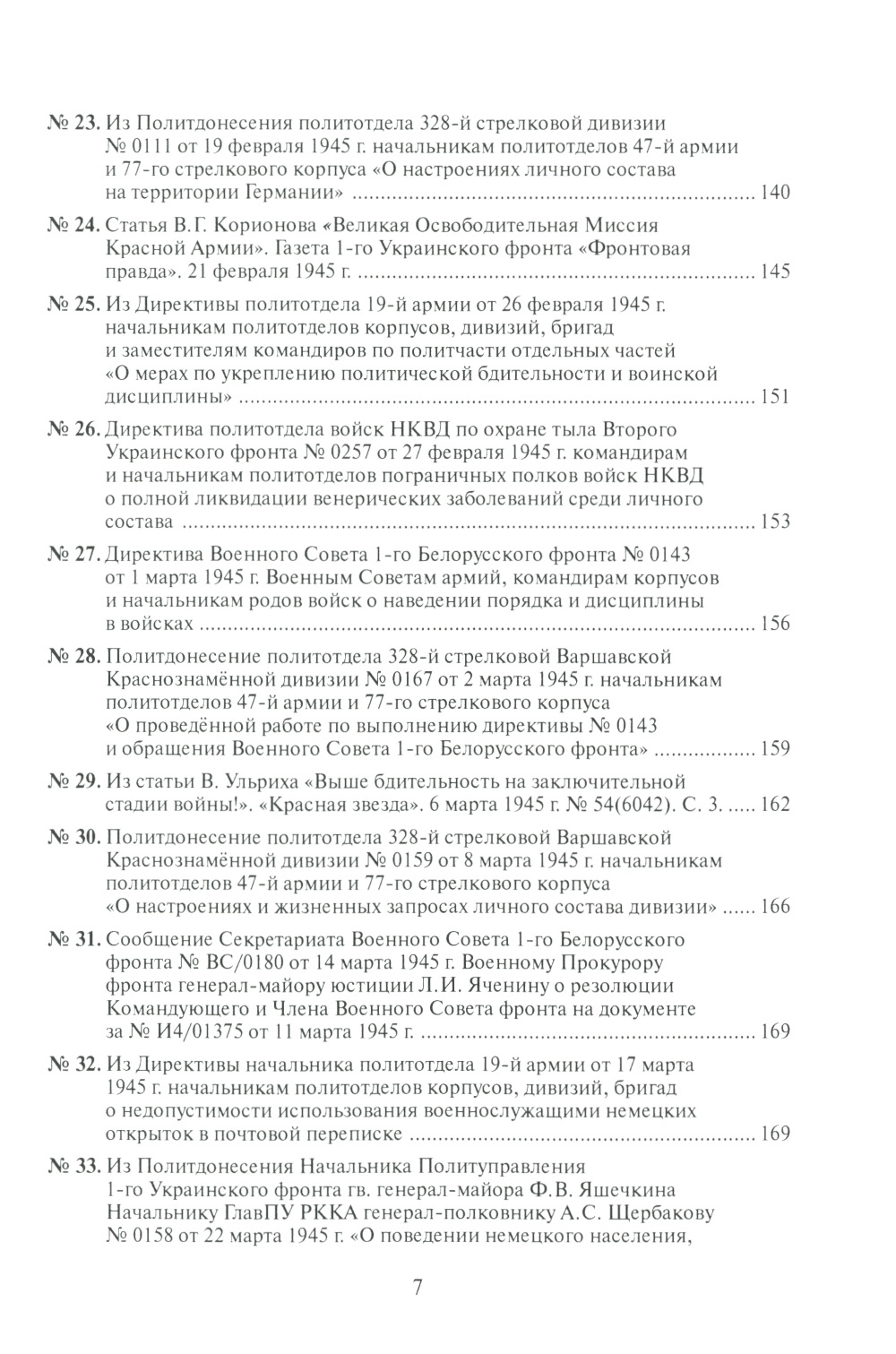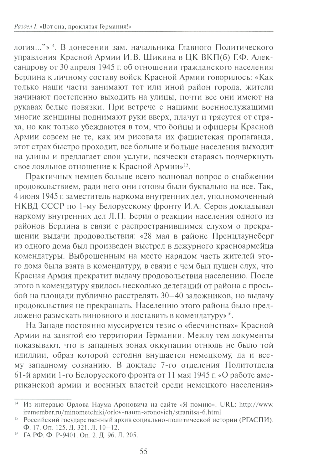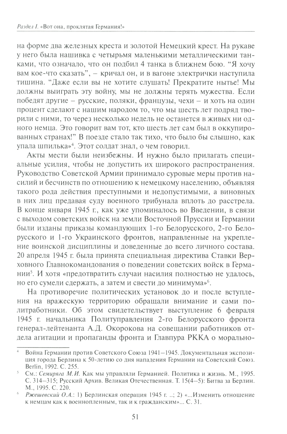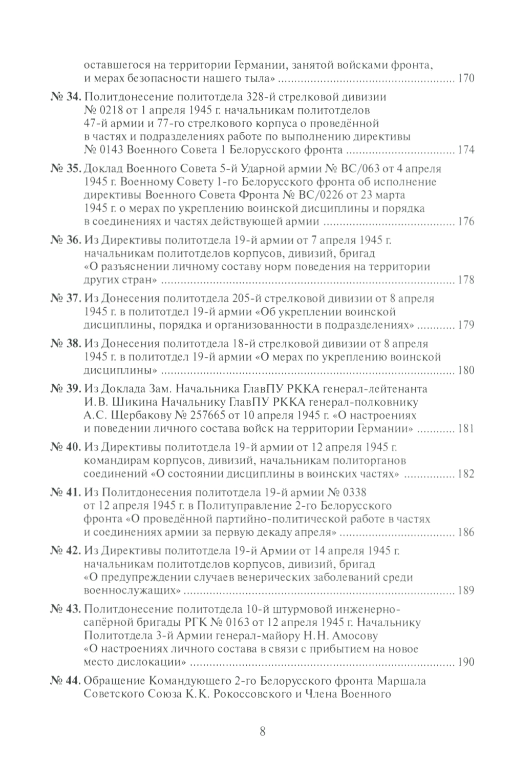 Сборник, посвященный социально-психологическим аспектам завершающего этапа Великой Отечественной войны и Освободительной миссии Красной Армии в Европе, содержит недавно рассекреченные документы и материалы из Центрального архива Министерства обороны Российской Федерации, Российского государственного военного архива, а также Государственного архива Российской Федерации и Российского государственного архива социально-политической истории. В издании рассматриваются острые дискуссионные вопросы: настроения и поведение советских военнослужащих на вражеской территории Германии и Восточной Пруссии; система организации посылок из действующей Красной Армии в тыловые районы СССР; сложные взаимоотношения между немецким гражданским населением и представителями других народов освобожденной Европы в 1945 г. Материалы данной публикации представляют не только академический интерес, но могут быть использованы в политической практике ведения современной информационно-психологической войны для противодействия антироссийской пропаганде, мифологизации и фальсификации истории, которые проводятся зарубежными политиками и СМИ в целях искажения, принижения и отрицания роли СССР в победе над фашизмом во Второй мировой войне. Также они имеют значение в важном для российского общества вопросе - сохранения объективного образа Великой Отечественной войны в исторической памяти и массовом сознании российских граждан.