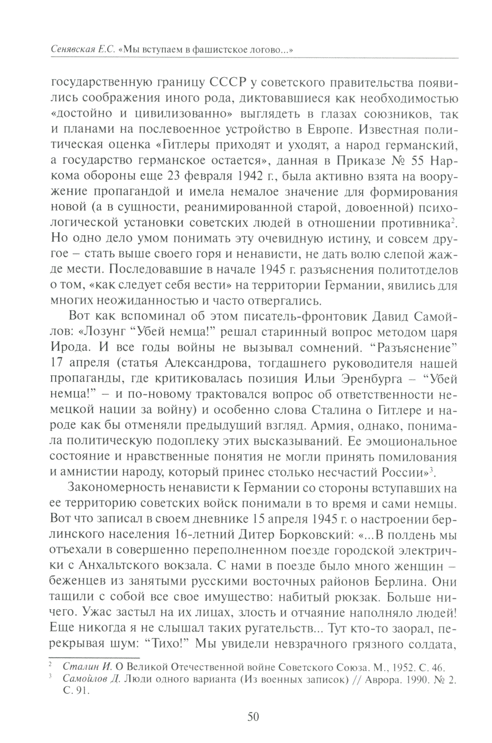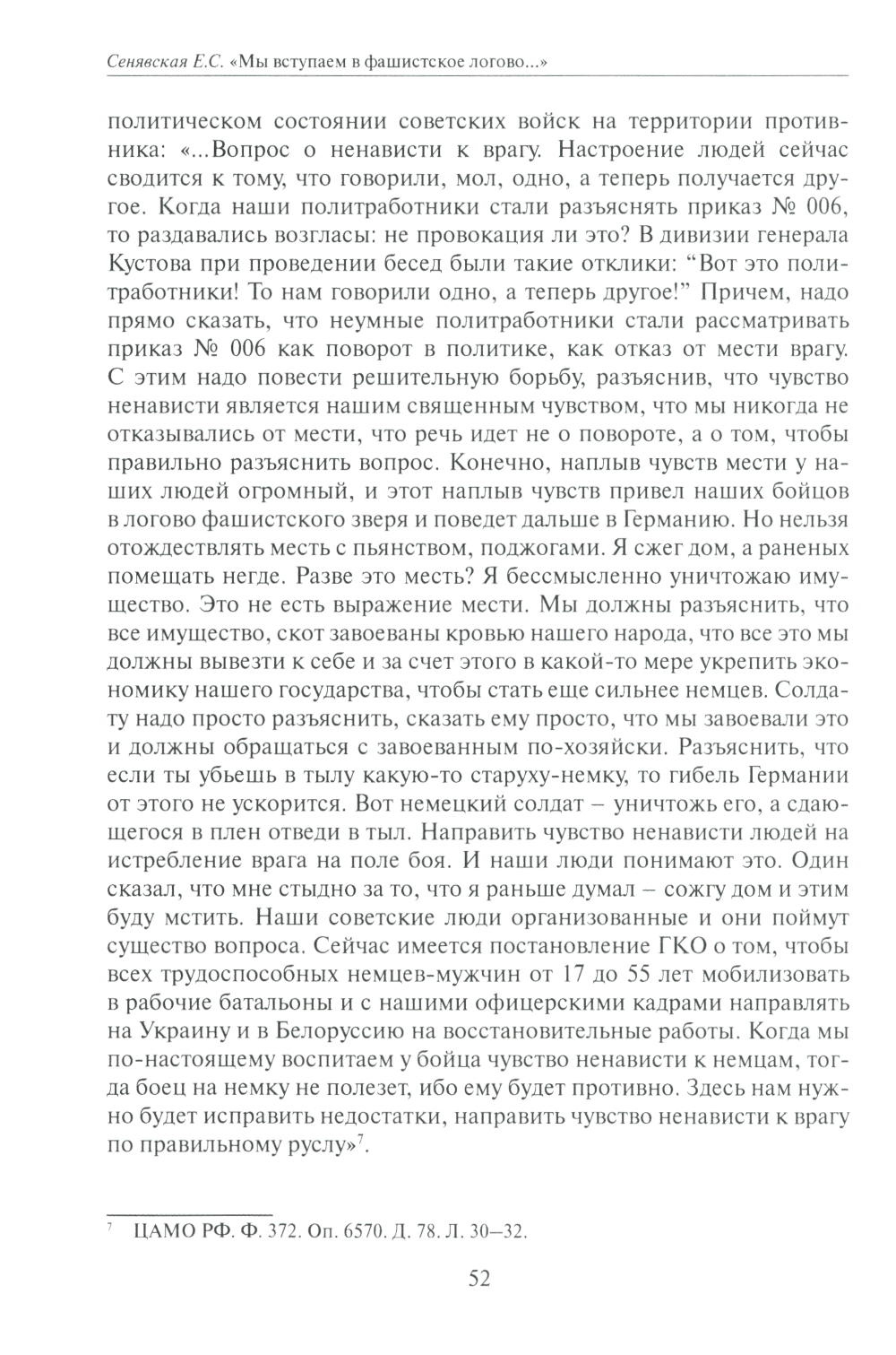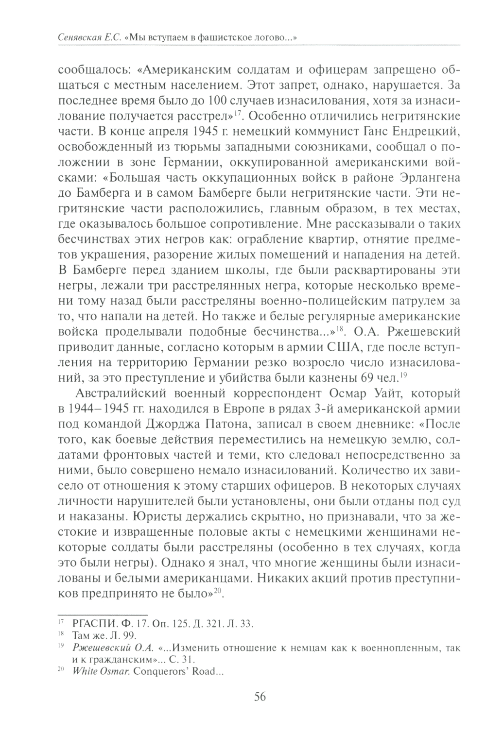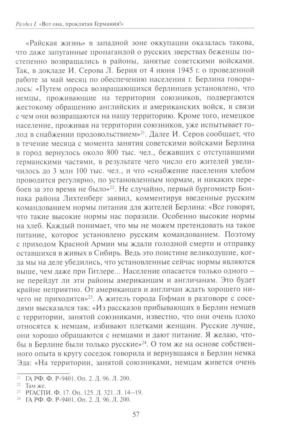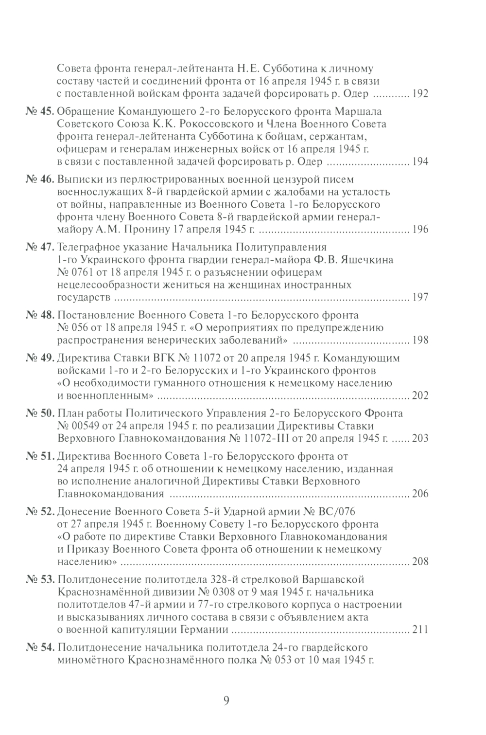 Сборник, посвященный социально-психологическим аспектам завершающего этапа Великой Отечественной войны и Освободительной миссии Красной Армии в Европе, содержит недавно рассекреченные документы и материалы из Центрального архива Министерства обороны Российской Федерации, Российского государственного военного архива, а также Государственного архива Российской Федерации и Российского государственного архива социально-политической истории. В издании рассматриваются острые дискуссионные вопросы: настроения и поведение советских военнослужащих на вражеской территории Германии и Восточной Пруссии; система организации посылок из действующей Красной Армии в тыловые районы СССР; сложные взаимоотношения между немецким гражданским населением и представителями других народов освобожденной Европы в 1945 г. Материалы данной публикации представляют не только академический интерес, но могут быть использованы в политической практике ведения современной информационно-психологической войны для противодействия антироссийской пропаганде, мифологизации и фальсификации истории, которые проводятся зарубежными политиками и СМИ в целях искажения, принижения и отрицания роли СССР в победе над фашизмом во Второй мировой войне. Также они имеют значение в важном для российского общества вопросе - сохранения объективного образа Великой Отечественной войны в исторической памяти и массовом сознании российских граждан.