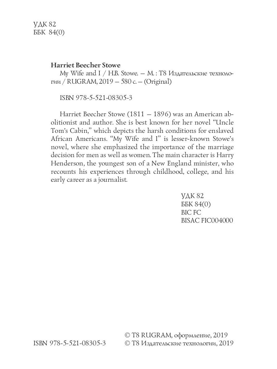 Harriet Beecher Stowe (1811 - 1896) was an American abolitionist and author. She is best known for her novel "Uncle Tom's Cabin," which depicts the harsh conditions for enslaved African Americans. "My "Wife and I" is lesser-known Stowe's novel, where she emphasized the importance of the marriage decision for men as well as women. The main character is Harry Henderson, the youngest son of a New England minister, who recounts his experiences through childhood, college, and his early career as a journalist.| Издательство | Т8 RUGRAM |