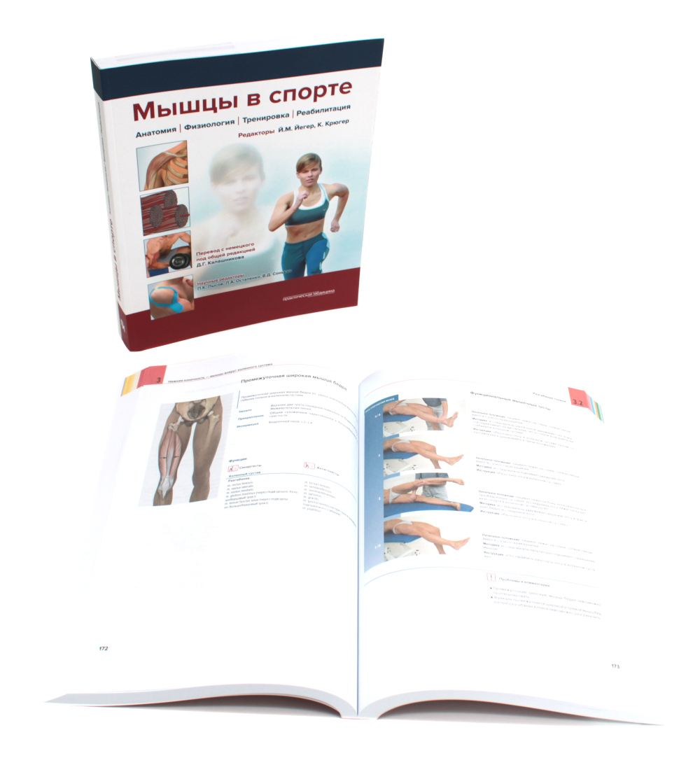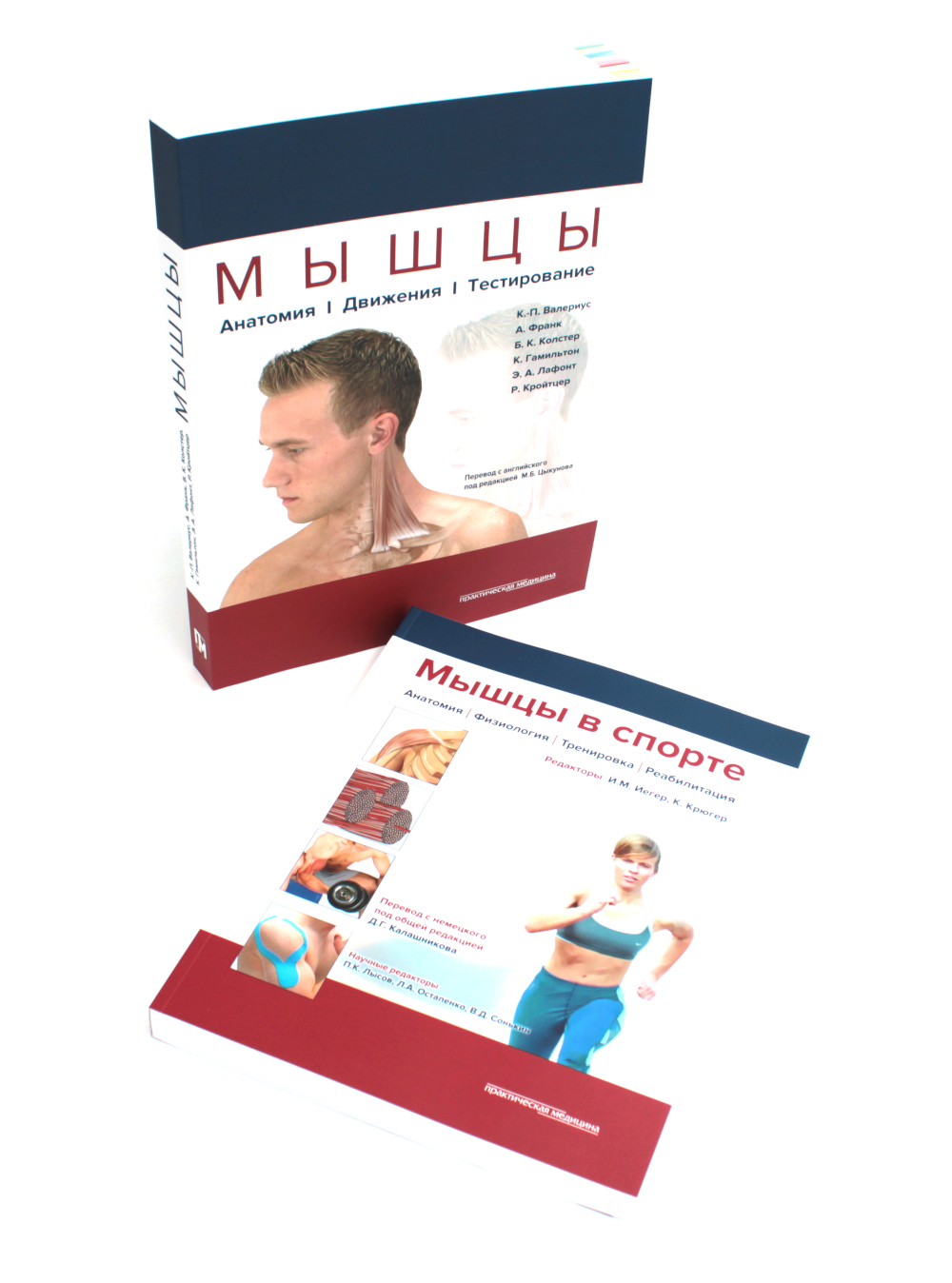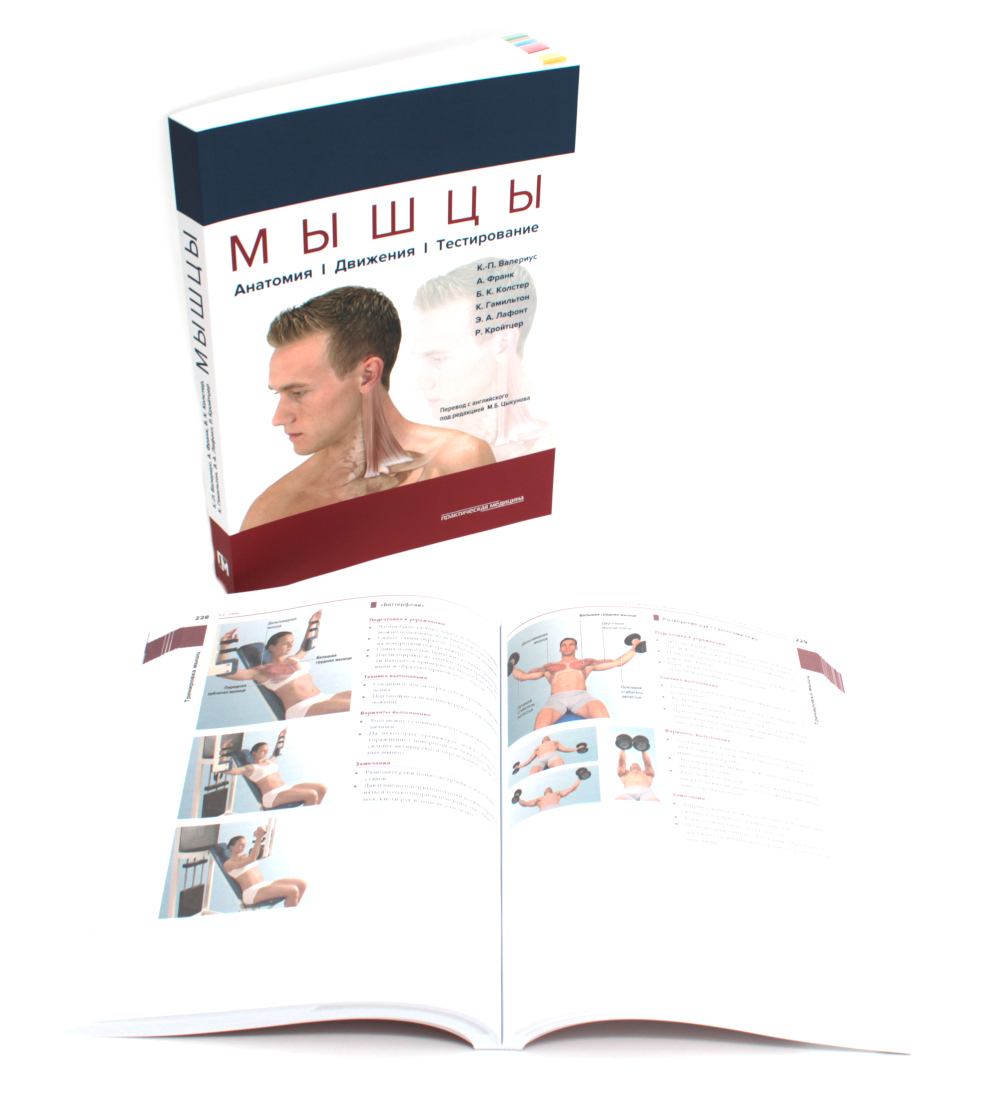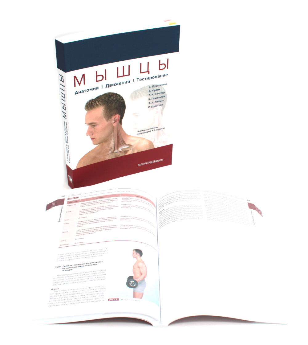 Комплект из 2 книг: Мышцы. Анатомия. Движения. Тестирование Эта книга, подготовленная группой немецких специалистов, работающих в области реабилитации, стала бестселлером на Западе, выдержав 5 изданий. Она представляет собой справочник по мышцам человеческого тела, нацеленный на диагностику нарушений их функции. Каждая мышца рассматривается в зависимости от конкретного сустава и осей движения. В каждом случае приведены синергисты и антагонисты всех возможных движений мышцы. Данная структура книги позволяет сразу получить весь объем информации по мышце. Книга хорошо иллюстрирована. Особый акцент был сделан на поверхностной анатомии опорно-двигательного аппарата, чтобы облегчить ориентацию в топографии мышц, их идентификацию и пальпацию. Для ортопедов, неврологов, ревматологов, врачей ЛФК, физиотерапевтов, мануальных терапевтов, эрготерапевтов, массажистов и других специалистов, занимающихся опорно-двигательным аппаратом, его заболеваниями, лечением и реабилитацией. Мышцы в спорте. Анатомия. Физиология.Тренировки. Реабилитация. Наука о спорте, как и любая научная дисциплина, постоянно развивается. Новые экспериментальные и клинические исследования расширяют наши знания в области лечения и тренировки. Авторы и издательство приложили все усилия, чтобы представленная в данном пособии информация сохранила свою актуальность к моменту его издания. Тем не менее читателю рекомендуется тщательно проверять все рекомендации и при необходимости проконсультироваться со специалистами, чтобы учесть все индивидуальные противопоказания или особенности человека. Вся ответственность за применение описанных материалов, лечебного оборудования, а также лечебных и тренировочных методик лежит только на тренере, инструкторе по лечебной физкультуре или враче, их применяющих. В данном пособии для легкости чтения все лица представлены в мужском роде (спортсмен, пациент и т. д.). При этом подразумевается, что во все виды деятельность в равной мере вовлечены оба пола. Книга представляет собой теоретическое и практическое пособие, составленное авторами, работающими в различных областях, - спортивной медицине, физиологии, клинической медицине, лечебной физкультуре, - а также профессиональными тренерами. Издание состоит из 4 разделов: анатомия мышц, физиология мышц, тренировка мышц (с учетом их анатомии и физиологии), а также профилактика и реабилитация. Наглядные иллюстрации демонстрируют места начала и прикрепления мышц, их анатомическое расположение. В сопровождающем тексте описана их функция. Уникальная особенность книги состоит в том, что все характеристики мышц рассмотрены применительно к различным видам спорта и представлены в виде наглядных таблиц. Ценность издания также обусловлена наличием практических рекомендаций для всех видов тренировок. В заключительном разделе продемонстрированы основные принципы тейпирования и спортивного массажа. Для тренеров и спортсменов.| Издательство | Практическая медицина |