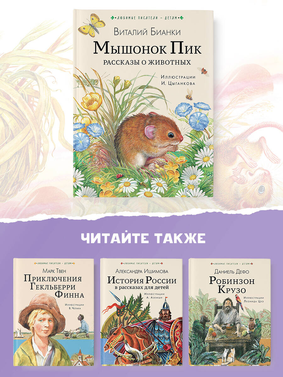 Виталий Валентинович Бианки - известный писатель-натуралист, "переводчик с бессловесного". Он прекрасно знал природу родной страны, бесконечно её любил, а благодаря писательскому таланту смог передать эту любовь читателю. В сборник "Мышонок Пик. Рассказы о животных" вошли самые лучшие произведения автора о неповторимом и удивительном мире вокруг. Рассказы и сказки В. Бианки изучают в начальной школе, они входят в круг обязательного детского чтения. Рисунки И. Цыганкова. Для младшего школьного возраста.