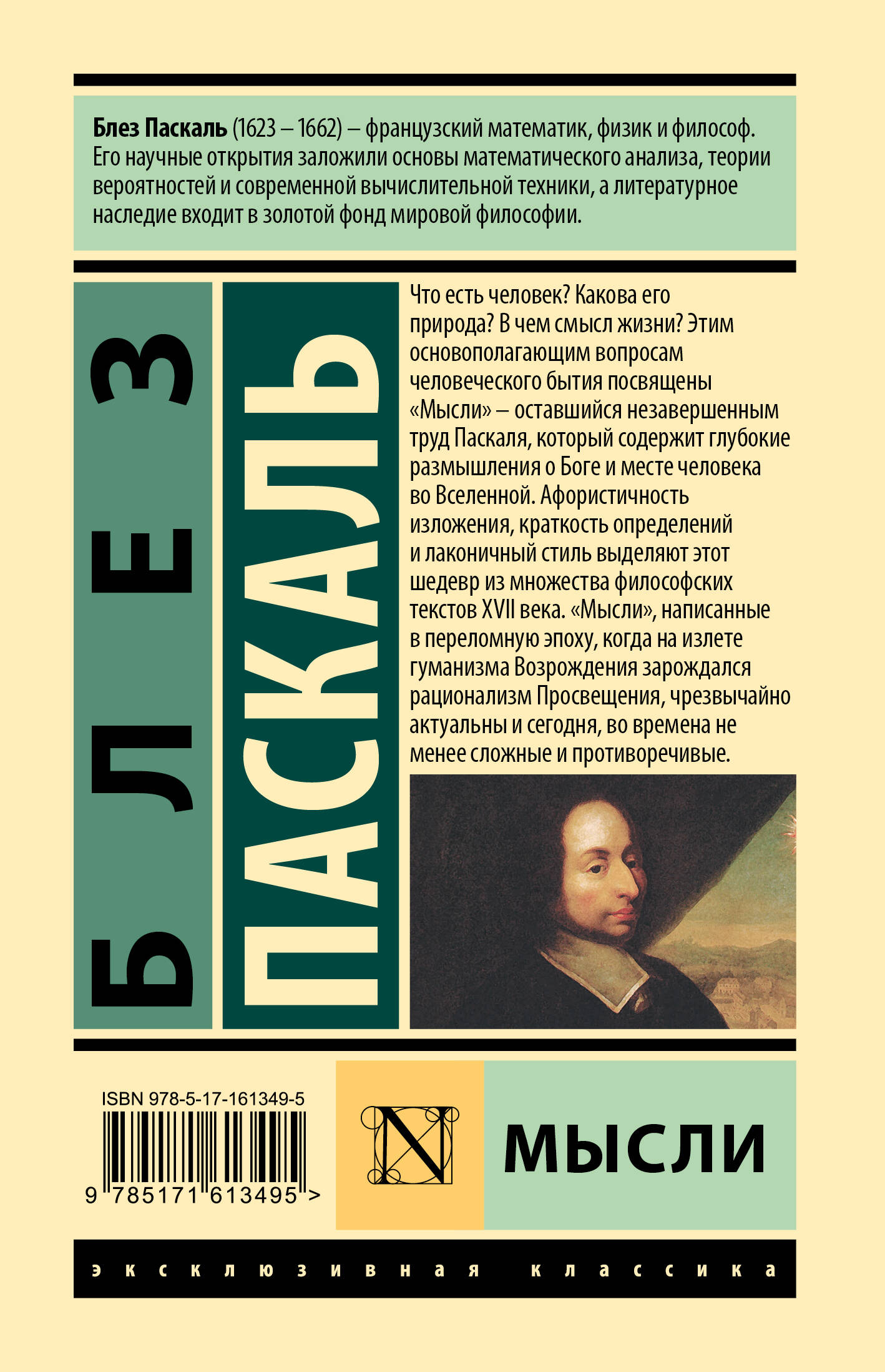 - «Мысли» - труд всей жизни Блеза Паскаля, так и оставшийся незавершенным и изданный уже после смерти философа. - Блез Паскаль - французский математик, физик и философ, заложивший основы математического анализа, теории вероятностей и современной вычислительной техники. - «Мысли» - коллекция из 912 идей, которые размышляют над такими темами как «Что есть человек? Какова его природа? В чем смысл жизни» и другими основополагающими вопросами человеческого бытия. - «Мысли» Паскаля выделяются на фоне философских текстов его современников афористичностью изложения, краткостью определений и лаконичным стилем. - Издание в серии «Эксклюзивная классика» (Лучшее) - в узнаваемом оформлении и в твердой обложке.
