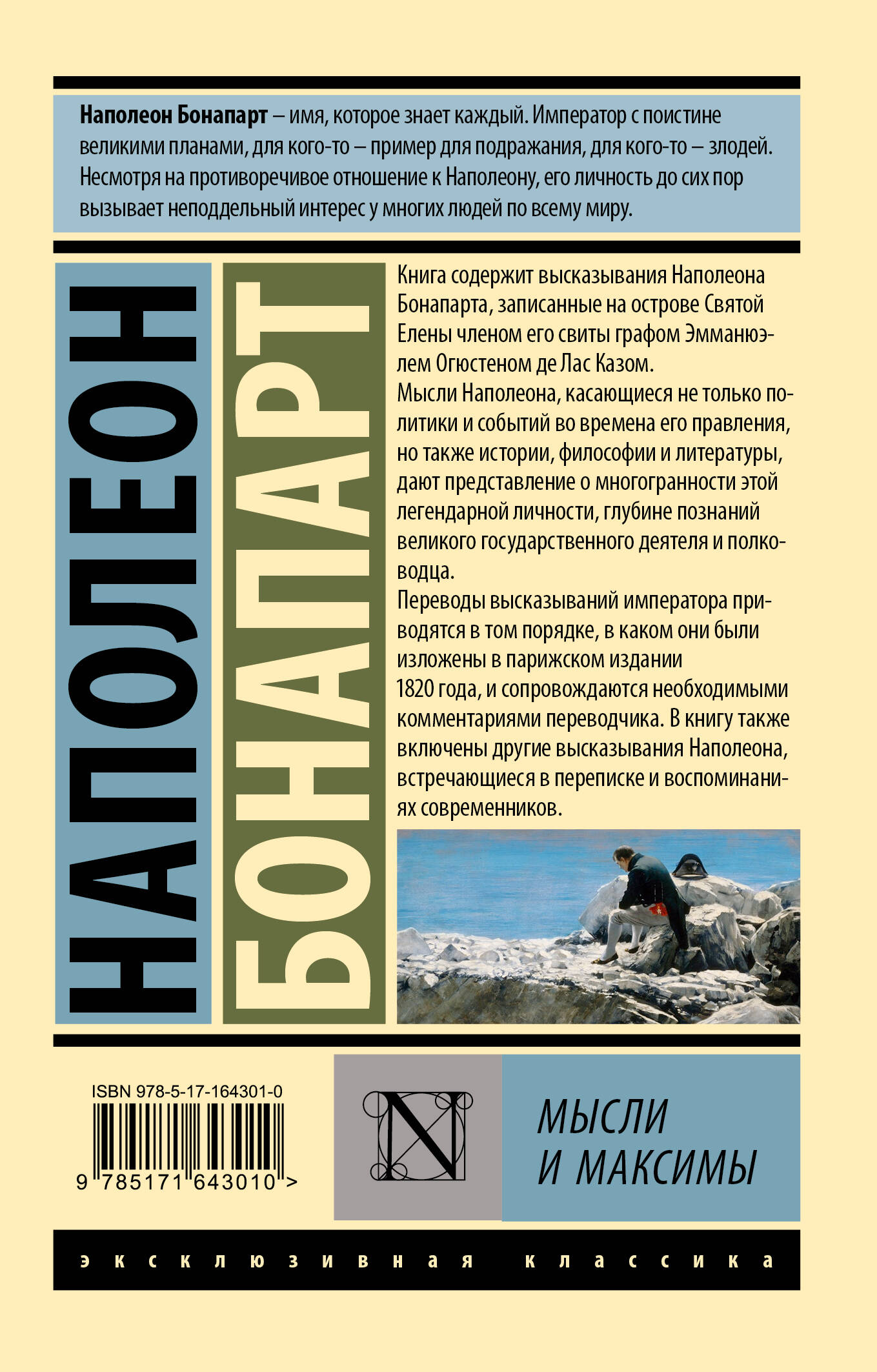 Прежде чем стать выдающимся полководцем и императором, Наполеон Бонапарт увлекался литературой и даже написал художественный роман «Клиссон и Евгения». После того, как его Империя рухнула, а сам он оказался в изгнании на острове Святой Елены, опальный правитель вновь взялся за перо и написал сразу две книги - «Воспоминание об истории с Наполеоном» и «Мысли и максимы». В книгу «Мысли и максимы» вошли афористические зарисовки бывшего императора - остроумные и язвительные заметки об истории, политике, литературе и философии, демонстрирующие всю многогранность познаний и талантов Наполеона.