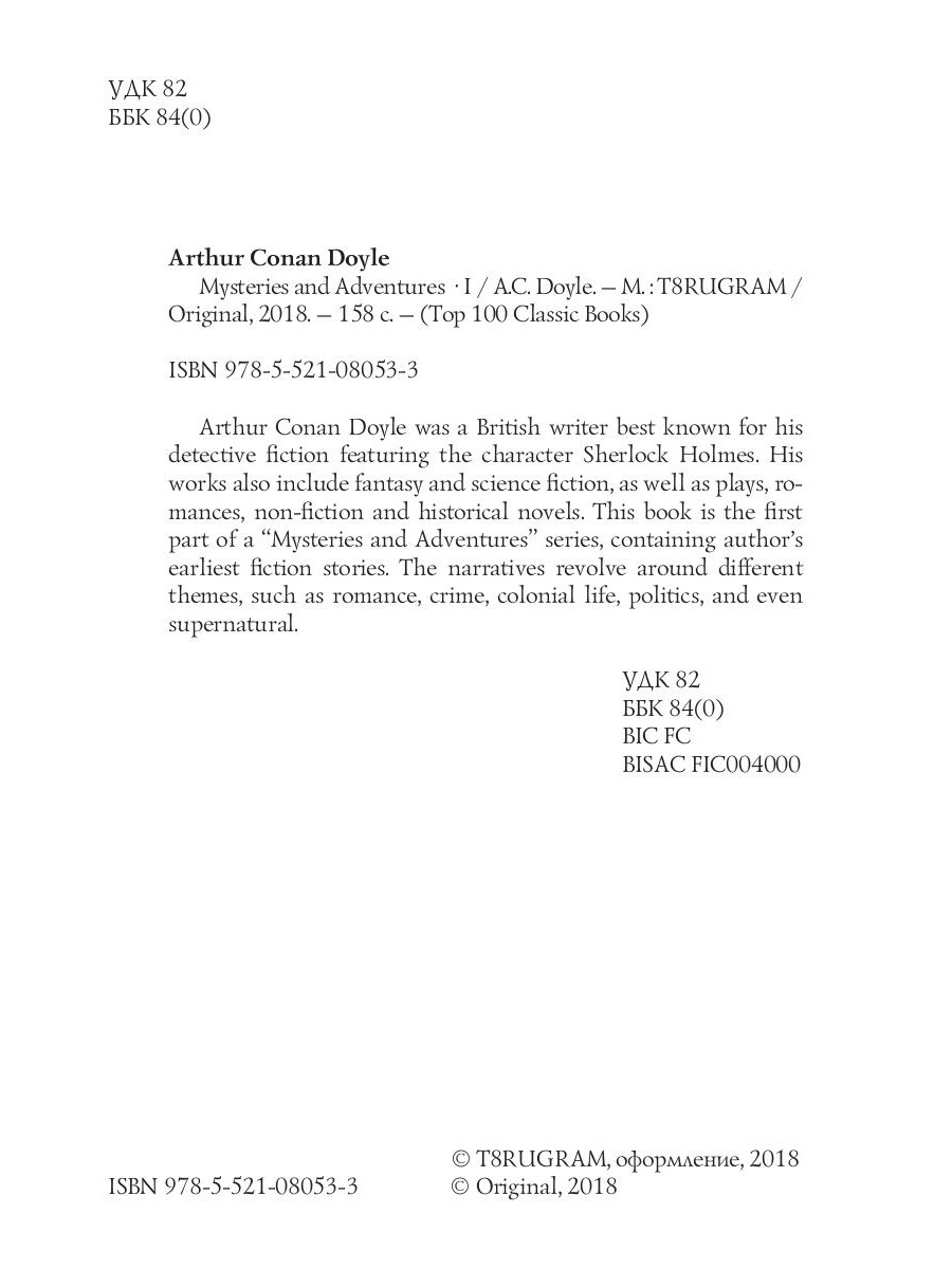 Arthur Conan Doyle was a British writer best known for his detective fiction featuring the character Sherlock Holmes. His works also include fantasy and science fiction, as well as plays, romances, non-fiction and historical novels. This book is the first part of a "Mysteries and Adventures" series, containing author's earliest fiction stories. The narratives revolve around different themes, such as romance, crime, colonial life, politics, and even supernatural.| Издательство | Т8 RUGRAM |