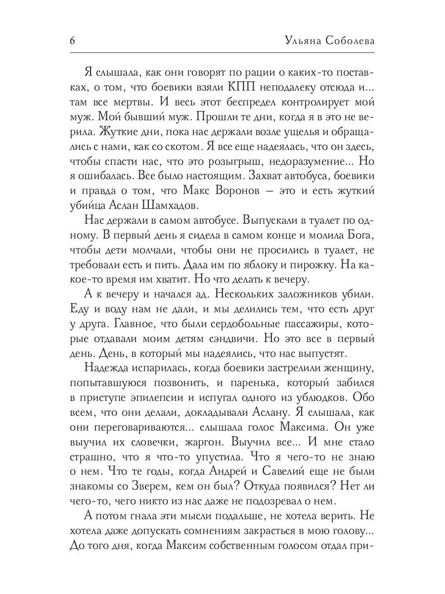 Что может быть ужаснее, чем оказаться в захваченном террористами автобусе? Например, узнать, что твой бывший муж - их главарь, жуткий убийца Аслан Шамхадов. Пока нас держали в плену в ущелье, я еще верила, что такого просто не может быть. Но потом увидела фото… Шрам, родинка. Это он. Мой муж. Боевики уже захватили контрольно-пропускной пункт и уничтожили всех, кто там был. Заложников убивают по одному, а оставшихся морят голодом и не выпускают даже в туалет. И все это - по приказу Максима, то есть… Аслана. Как выбраться из ловушки и спасти детей? И как смириться с кошмарной истиной, что некогда любимый человек оказался монстром?| Издательство | Т8 RUGRAM |