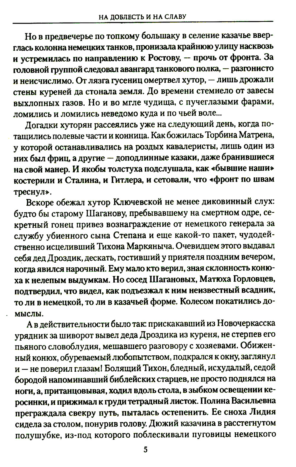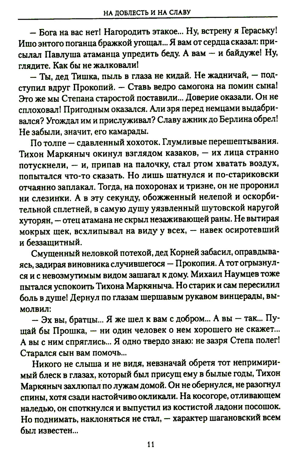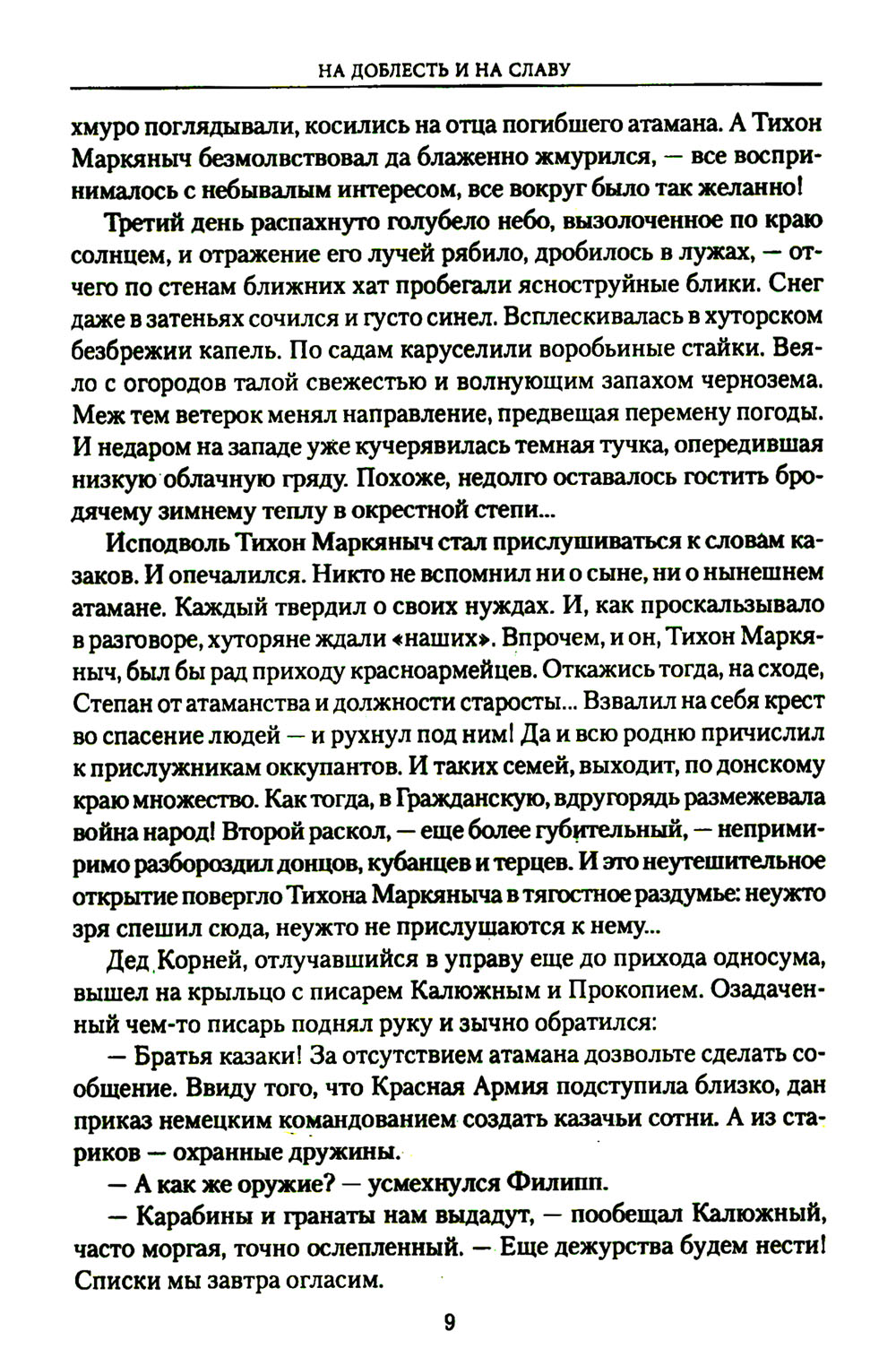 Роман «На доблесть и на славу» завершает дилогию известного ставропольского писателя Владимира Бутснко, посвященную судьбе казачества в годы Великой Отечественной войны. Лихолетье развело по обе стороны фронта казачий род Шагановых. Красноармеец Яков в составе сабельного эскадрона проходит ратный путь до Будапешта, приумножая славу предков. Ранениями и собственной кровью смывает он клеймо «сына старосты». Также нелегкие испытания выпадают на долю его жены Лидии, арестованной смершевцем только за то, что была невесткой атамана. Тяжелой оказалась стезя старшего поколения Шагановых и тех, кто поверил посулам гитлеровцев «даровать казачью вольницу». С документальной точностью и мастерством в романе рассказывается о скитаниях многих тысяч казачьих беженцев, о распрях атаманов, о пребывании Казачьего Стана в Белоруссии и Италии, о трагедии Лисица, когда английское командование обманом заставило казачьих изгоев и офицеров принять горестный «венец правды».| Издательство | Вече |