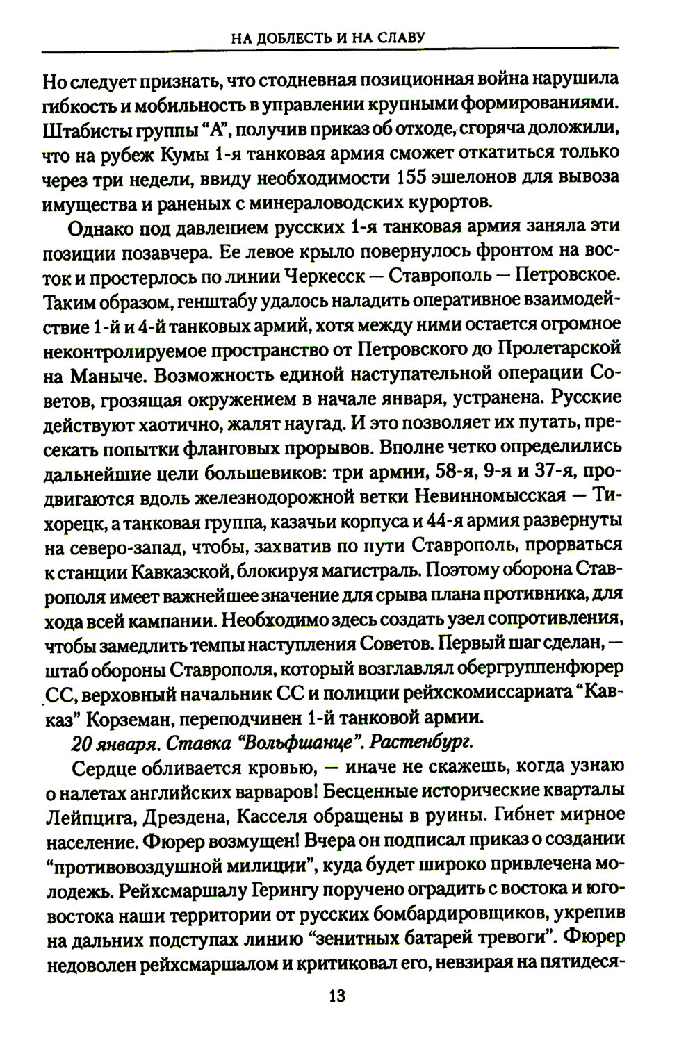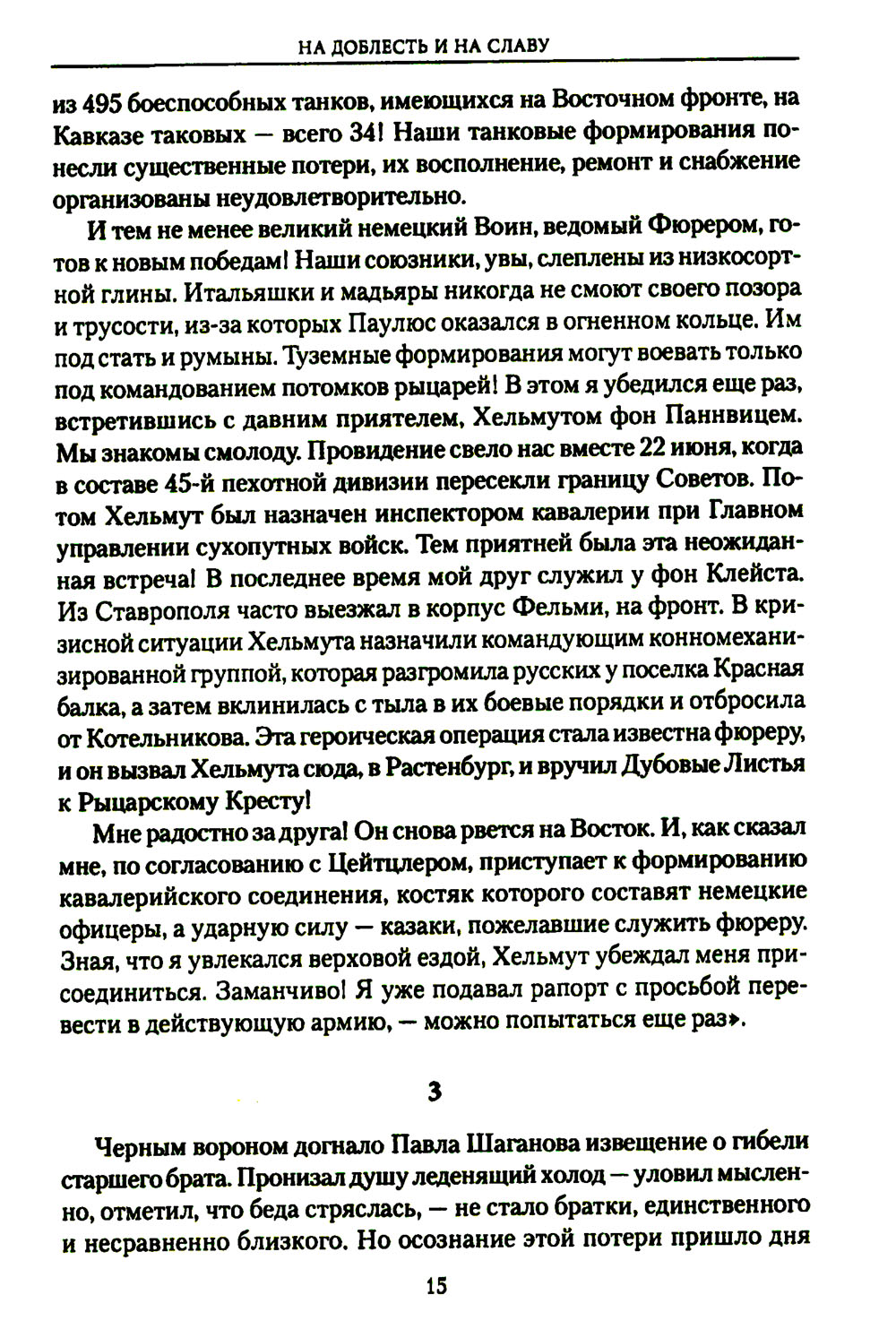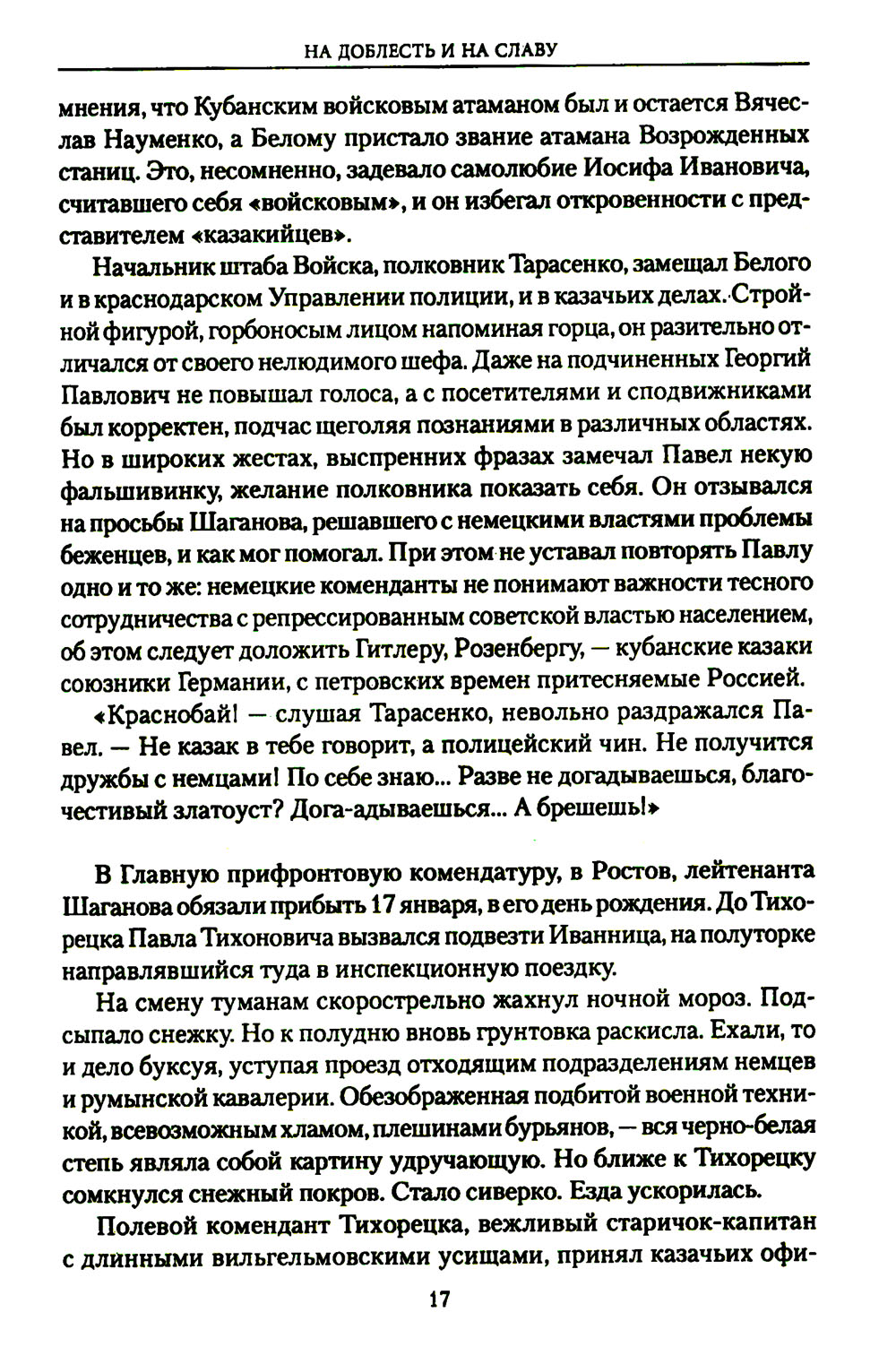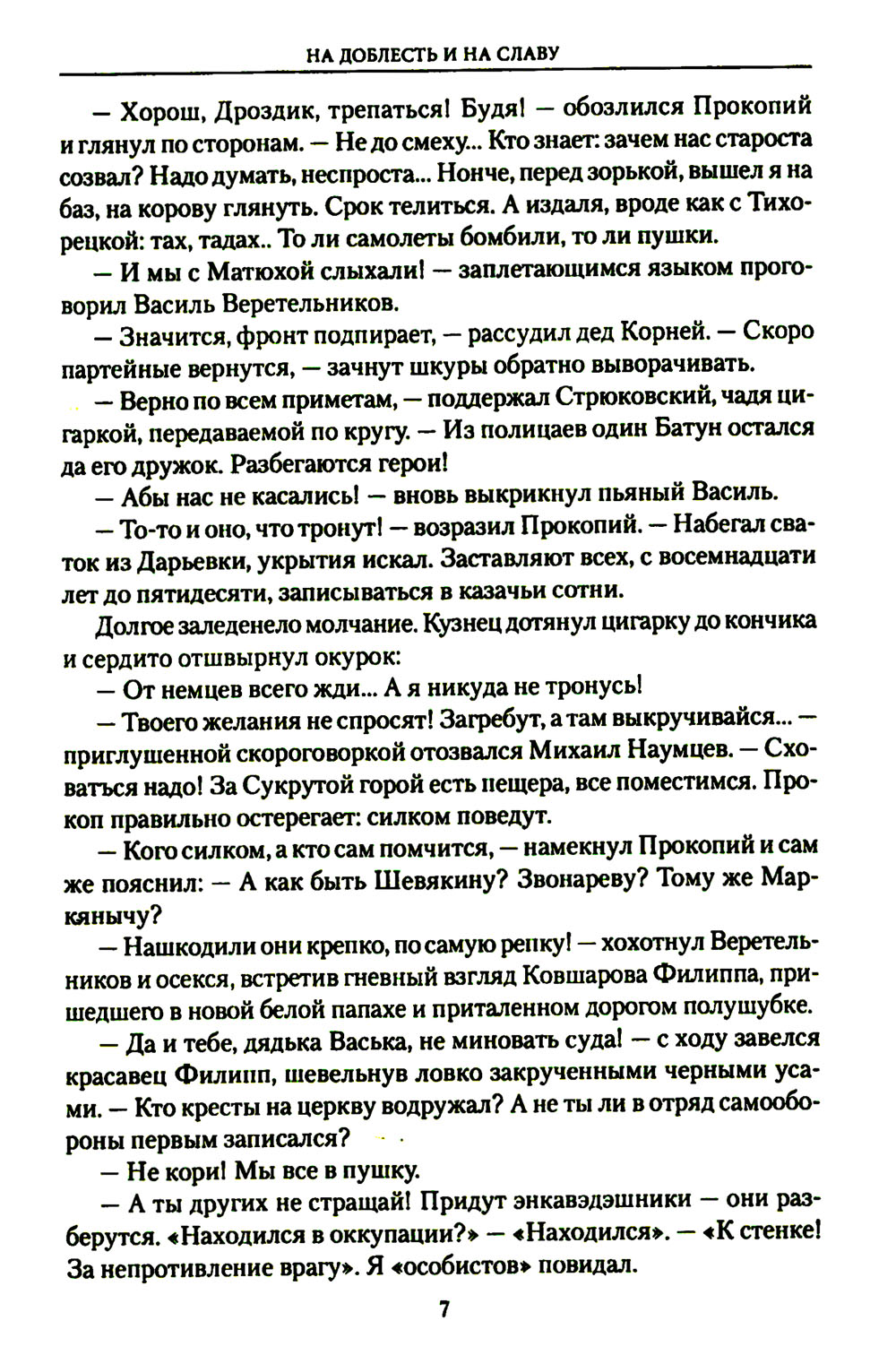 Роман «На доблесть и на славу» завершает дилогию известного ставропольского писателя Владимира Бутснко, посвященную судьбе казачества в годы Великой Отечественной войны. Лихолетье развело по обе стороны фронта казачий род Шагановых. Красноармеец Яков в составе сабельного эскадрона проходит ратный путь до Будапешта, приумножая славу предков. Ранениями и собственной кровью смывает он клеймо «сына старосты». Также нелегкие испытания выпадают на долю его жены Лидии, арестованной смершевцем только за то, что была невесткой атамана. Тяжелой оказалась стезя старшего поколения Шагановых и тех, кто поверил посулам гитлеровцев «даровать казачью вольницу». С документальной точностью и мастерством в романе рассказывается о скитаниях многих тысяч казачьих беженцев, о распрях атаманов, о пребывании Казачьего Стана в Белоруссии и Италии, о трагедии Лисица, когда английское командование обманом заставило казачьих изгоев и офицеров принять горестный «венец правды».| Издательство | Вече |