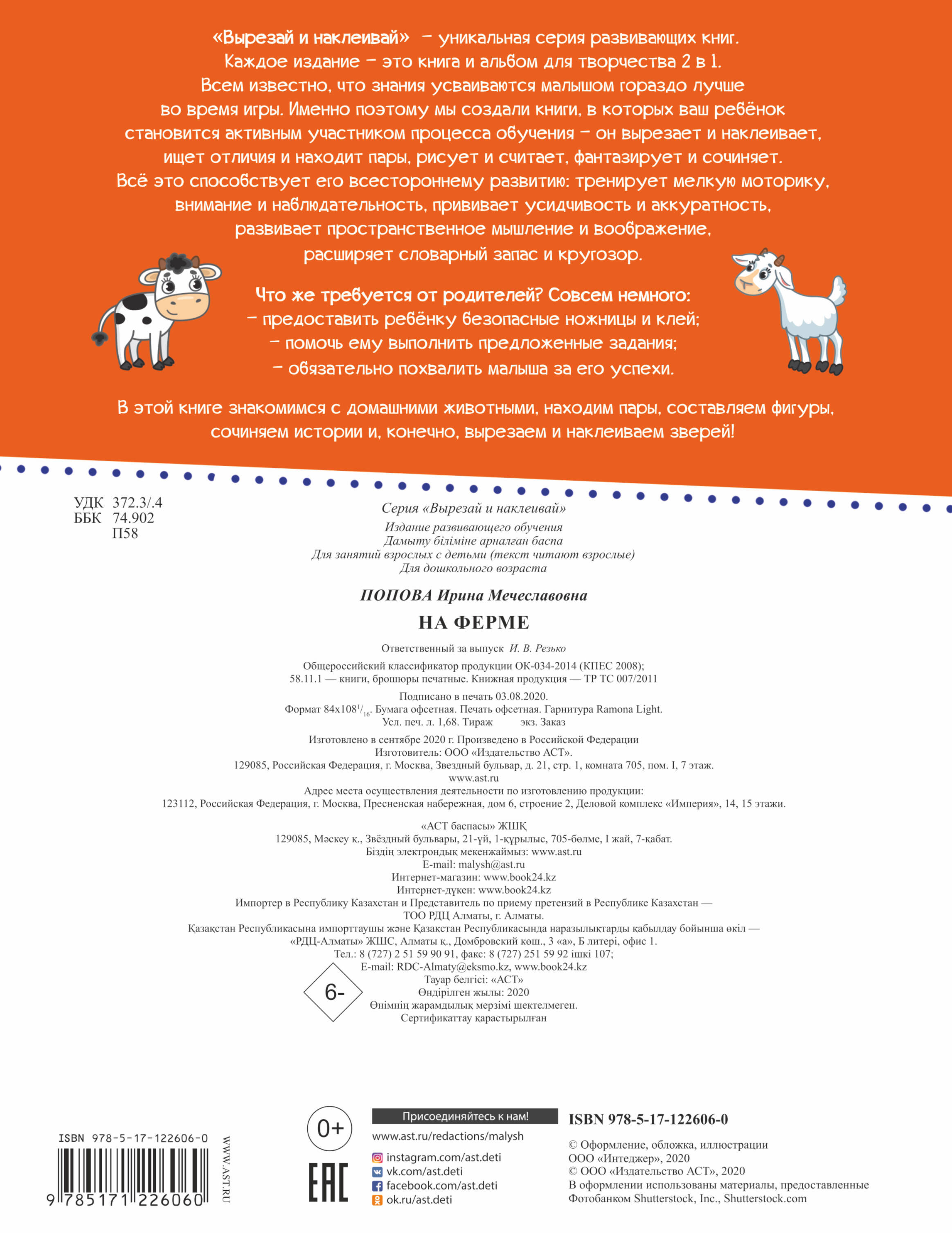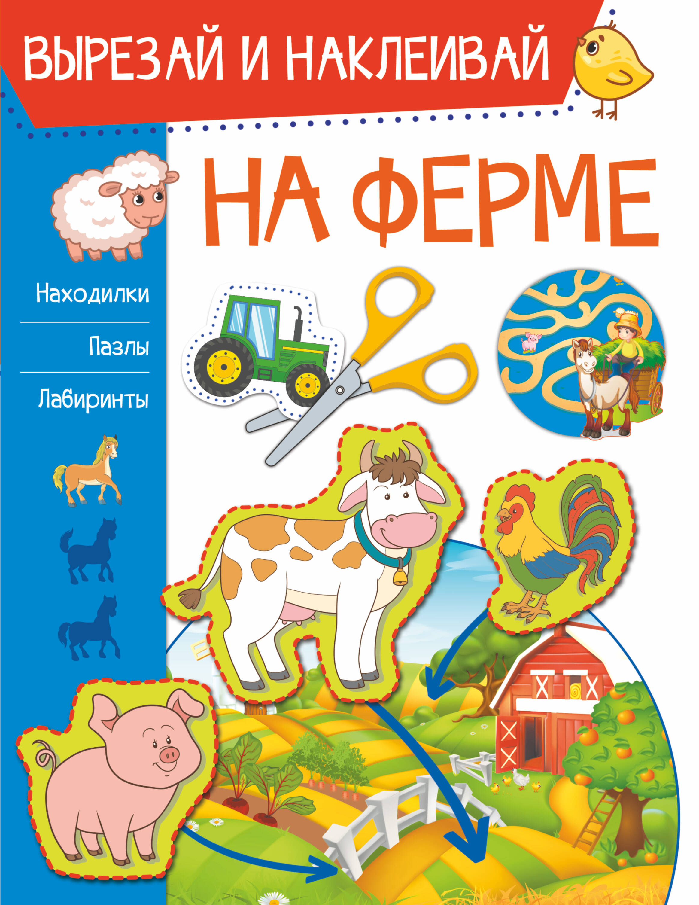 "Вырезай и наклеивай" - уникальная серия развивающих книг. Каждое издание - это книга и альбом для творчества 2 в 1. Ведь всем известно, что знания усваиваются малышом гораздо лучше во время игры. Именно поэтому мы создали книги, в которых ваш ребёнок становится активным участником учебного процесса - он рисует и считает, ищет отличия и находит пары, вырезает и наклеивает, фантазирует и сочиняет. Всё это способствует его всестороннему развитию: тренирует внимание и наблюдательность, прививает усидчивость и аккуратность, развивает пространственное мышление и воображение, расширяет словарный запас и кругозор. Что же требуется от родителей? Совсем немного: - предоставить ребёнку безопасные ножницы и клей; - прочитать задание и объяснить, что нужно делать; - помочь (если потребуется) вырезать детали внизу страницы; - наклеить готовые детали в нужное место на картинке; - обязательно похвалить малыша за его успехи. В этой книге знакомимся с домашними животными, находим пары, составляем фигуры, сочиняем истории и, конечно, вырезаем и наклеиваем зверей!