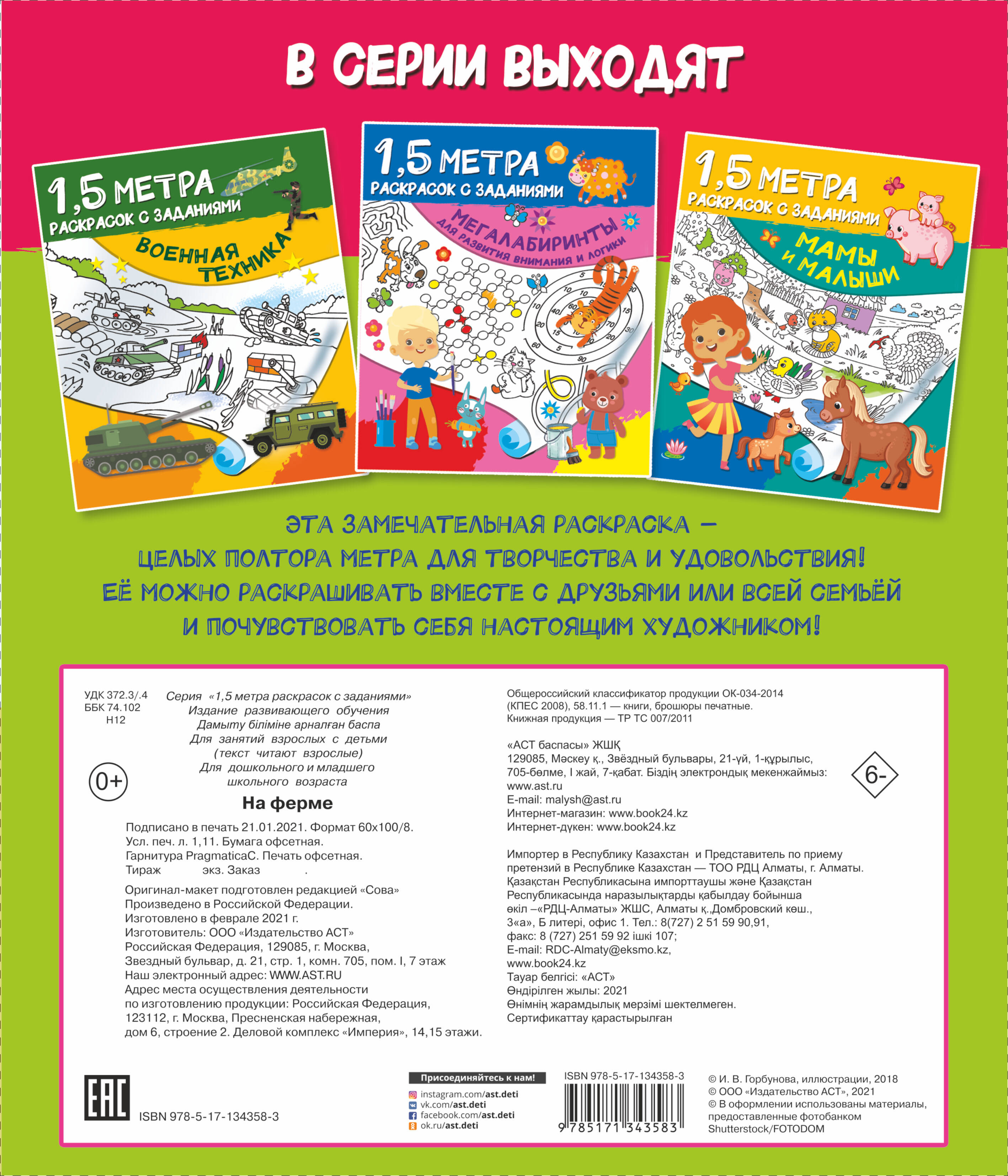 О чем эта книга Все дети любят рисовать и раскрашивать забавных зверят - малышам обязательно понравится новая серия книг «Полтора метра раскрасок с заданиями». Эту красочную полутораметровую активити-раскраску с игровыми заданиями можно разложить на полу или повесить на стену, можно раскрашивать карандашами или фломастерами, можно одному или компанией. В любом случае получится неповторимый шедевр! Кому эта книга будет интересна Уникальная активити-раскраска большого формата придумана специально для настоящих фантазеров и будущих художников. Каковы особенности этой книги Эта активити-раскраска - целых полтора метра для творчества и удовольствия, ее можно раскрашивать всей семьей. Увлекательная и полезная книжка с цветными картинками и игровыми заданиями отлично развивает пространственное мышление и воображение, наблюдательность, координацию и мелкую моторику. Множество деталей и милые мордашки домашних животных понравятся каждому маленькому фантазеру и художнику. Полтора метра раскрасок с заданиями - играем, раскрашиваем и творим в свое удовольствие!| Издательство | Издательство "АСТ" |