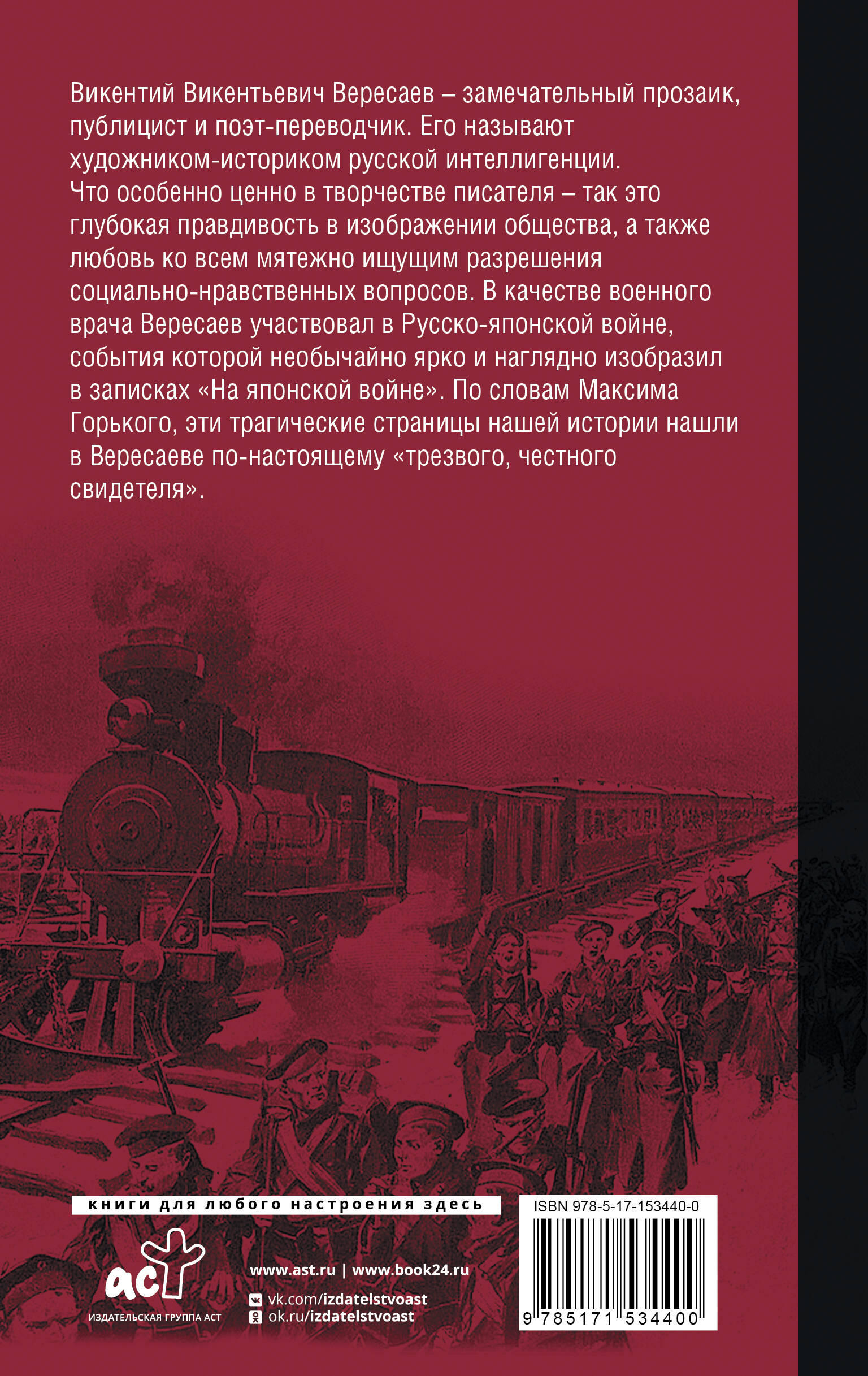Викентий Викентьевич Вересаев - замечательный прозаик, публицист и поэт-переводчик. Его называют художником-историком русской интеллигенции. Что особенно ценно в творчестве писателя так это глубокая правдивость в изображении общества, а также любовь ко всем, мятежно ищущим разрешения социально-нравственных вопросов. В качестве военного врача Вересаев участвовал в русско-японской войне, события которой необычайно ярко и наглядно изобразил в записках "На японской войне". По словам Максима Горького, эти трагические страницы нашей истории нашли в Вересаеве по-настоящему "трезвого, честного свидетеля". Из книги вы узнаете: • что случилось на Мандаринской дороге; • как повлияли события Русско-японской войны на автора; • почему в бое на Шахе команда врачей бездельничала. Для кого книга: • Для тех, кто любит жанр мемуары и воспоминания; • Для тех, кто хочет погрузиться в прошлое.| Издательство | ИЗДАТЕЛЬСТВО "АСТ" |