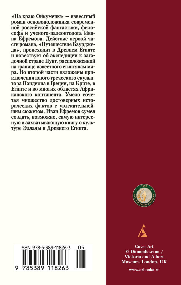 "На краю Ойкумены" - известный роман основоположника современной российской фантастики, философа и ученого-палеонтолога Ивана Ефремова. Действие первой части романа, "Путешествие Баурджеда", происходит в Древнем Египте и повествует об экспедиции к загадочной стране Пунт, расположенной на границе известного египтянам мира. Во второй части изложены приключения юного греческого скульптора Пандиона в Греции, на Крите, в Египте и во многих областях Африканского континента. Умело сочетая множество достоверных исторических фактов с увлекательнейшим сюжетом, Иван Ефремов сумел создать, возможно, самую интересную и захватывающую книгу о культуре Эллады и Древнего Египта.| Издательство | Азбука-Аттикус Издат.группа ООО |