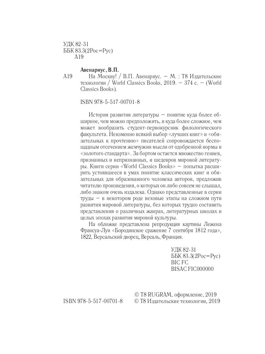 История развития литературы - понятие куда более обширное, чем можно предположить, и куда более сложное, чем может вообразить студент-первокурсник филологического факультета. Неизменно всякий выбор «лучших книг» и «обязательных к прочтению» писателей сопровождается беспощадным отсечением жемчужин мысли от одобренной нормы и «золотого стандарта». За бортом остается множество гениев, признанных и непризнанных, и шедевров мировой литературы. Книги серии «World Classics Books» - попытка расширить устоявшееся в умах понятие классических книг и обязательных для образованного человека авторов, предложив читателю произведения, о которых он либо совсем не слышал, либо знаком очень издалека. Однако представленные в серии труды - в некотором роде веховые этапы на сложном пути развития мировой литературы, без которых трудно составить представления о различных жанрах, литературных школах и целых эпохах развития мировой культуры. На обложке представлена репродукция картины Лежена Франсуа-Луи «Бородинское сражение 7 сентября 1812 года», 1822, Версальский дворец, Версаль, Франция.| Издательство | Т8 RUGRAM |