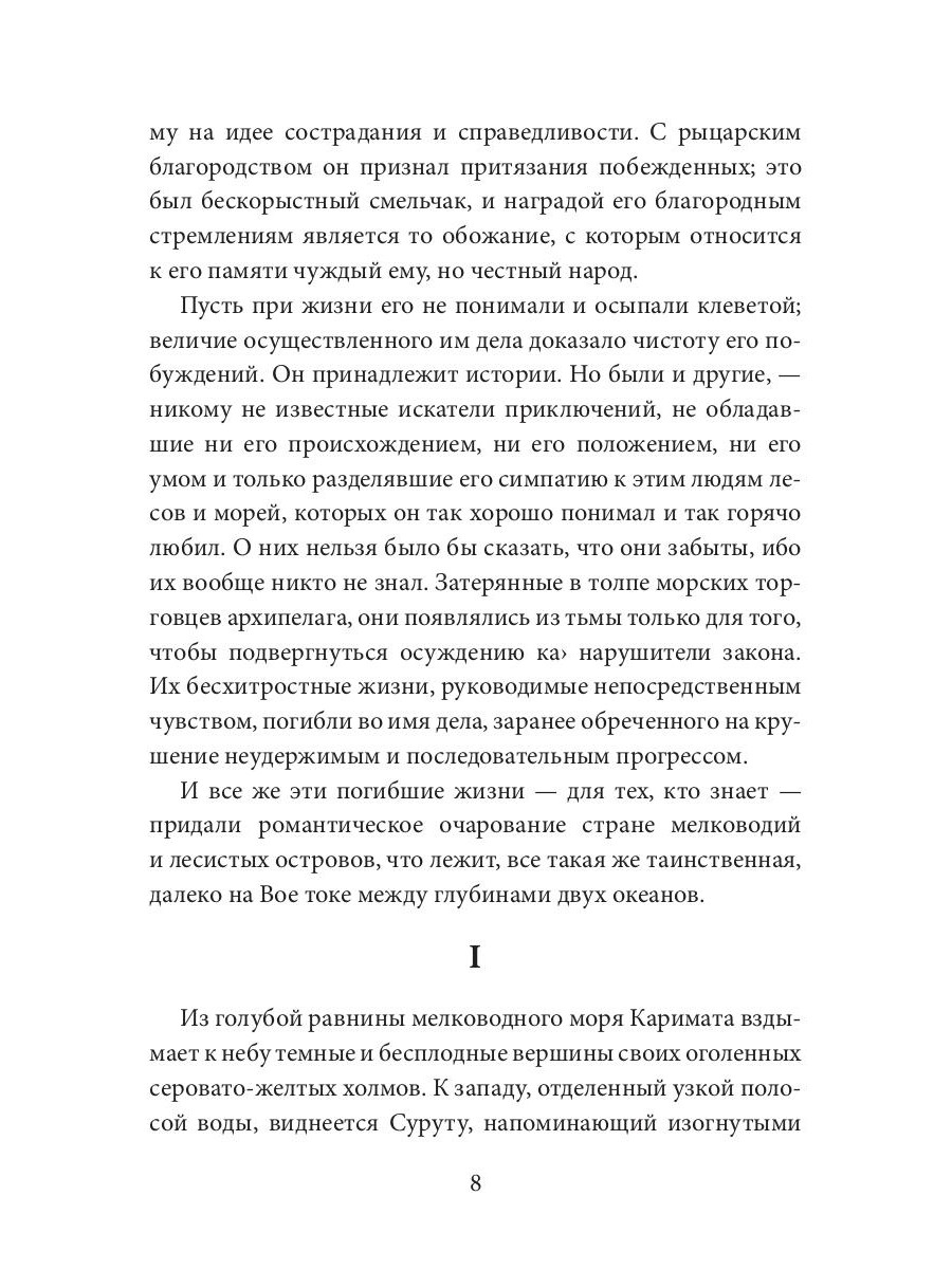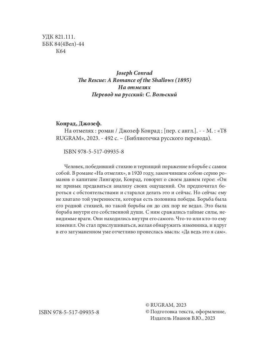 Человек, победивший стихию и терпящий поражение в борьбе с самим собой. В романе «На отмелях», в 1920 году, закончившем собою серию романов о капитане Лингарде, Конрад, говорит о своем давнем герое: «Он не привык предаваться анализу своих ощущений. Он предпочитал бороться с обстоятельствами и старался делать это и сейчас. Но сейчас ему не хватало той уверенности, которая есть половина победы. Борьба была его родной стихией, но такой борьбы он до сих пор не ведал. Это была борьба внутри его собственной души. С ним сражались тайные силы, невидимые враги. Они находились внутри его самого. Что-то или кто-то ему изменил. Он стал прислушиваться, желая обнаружить изменника, и вдруг в его затуманенном уме отчетливо пронеслась мысль: «Да ведь это я сам».| Издательство | Т8 RUGRAM |