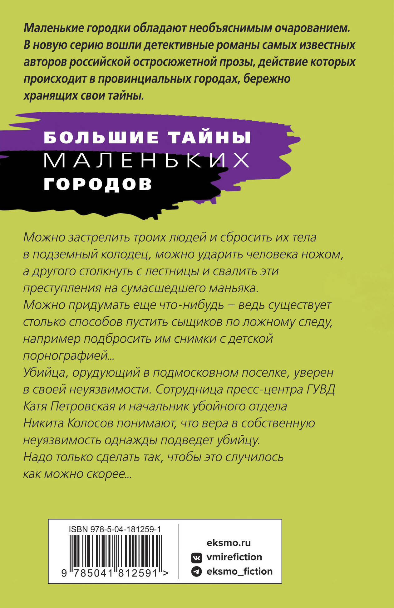 Можно застрелить троих людей и сбросить их тела в подземный колодец, можно ударить человека ножом, а другого столкнуть с лестницы и свалить эти преступления на сумасшедшего маньяка. Можно придумать еще что-нибудь - ведь существует столько способов пустить сыщиков по ложному следу, например, подбросить им снимки с детской порнографией… Убийца, орудующий в подмосковном поселке, уверен в своей неуязвимости. Сотрудница Пресс-центра ГУВД Катя Петровская и начальник «убойного отдела» Никита Колосов понимают, что вера в собственную неуязвимость однажды подведет убийцу. Надо только сделать так, чтобы это случилось как можно скорее… Романы потомственного следователя Татьяны Степановой позволяют читателю побывать в литературной «комнате страха». Таинственные убийства, почти осязаемая атмосфера преступления, томительное и тревожное ожидание чего-то неведомого, пугающего... Все это Татьяне Степановой удается воспроизвести просто блестяще. Случайные встречи, повседневные дела, незначительные детали изображаются в ее детективах в каком-то особом, драматическом свете, словно безобидный весенний луг перед стремительно надвигающейся грозой.| Издательство | ООО "Издательство "Эксмо" |