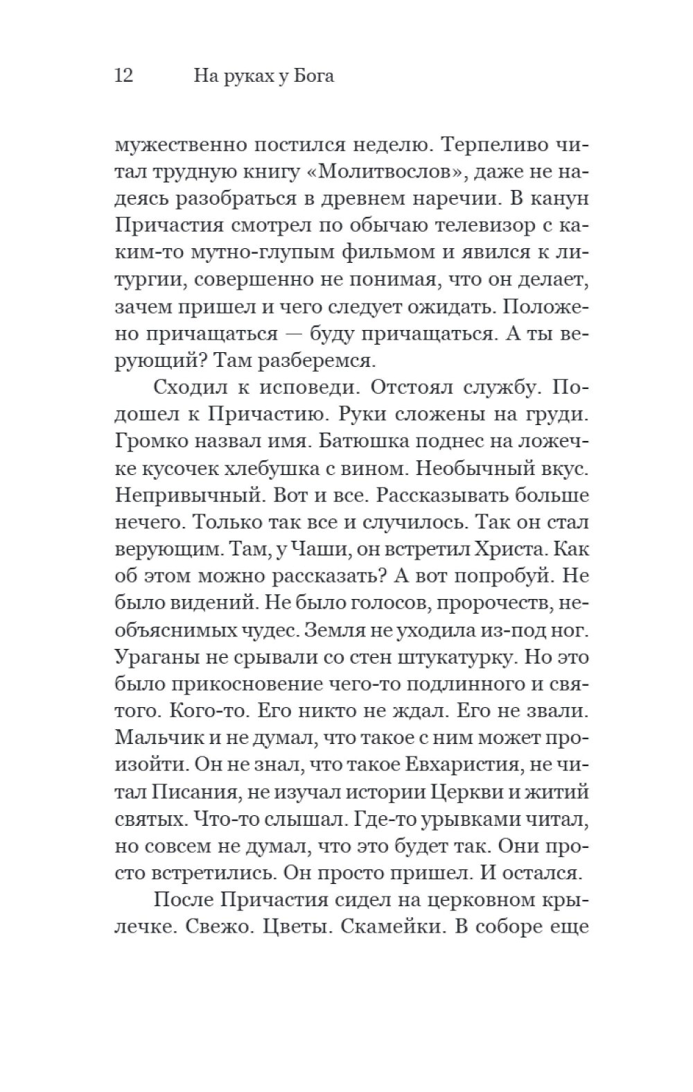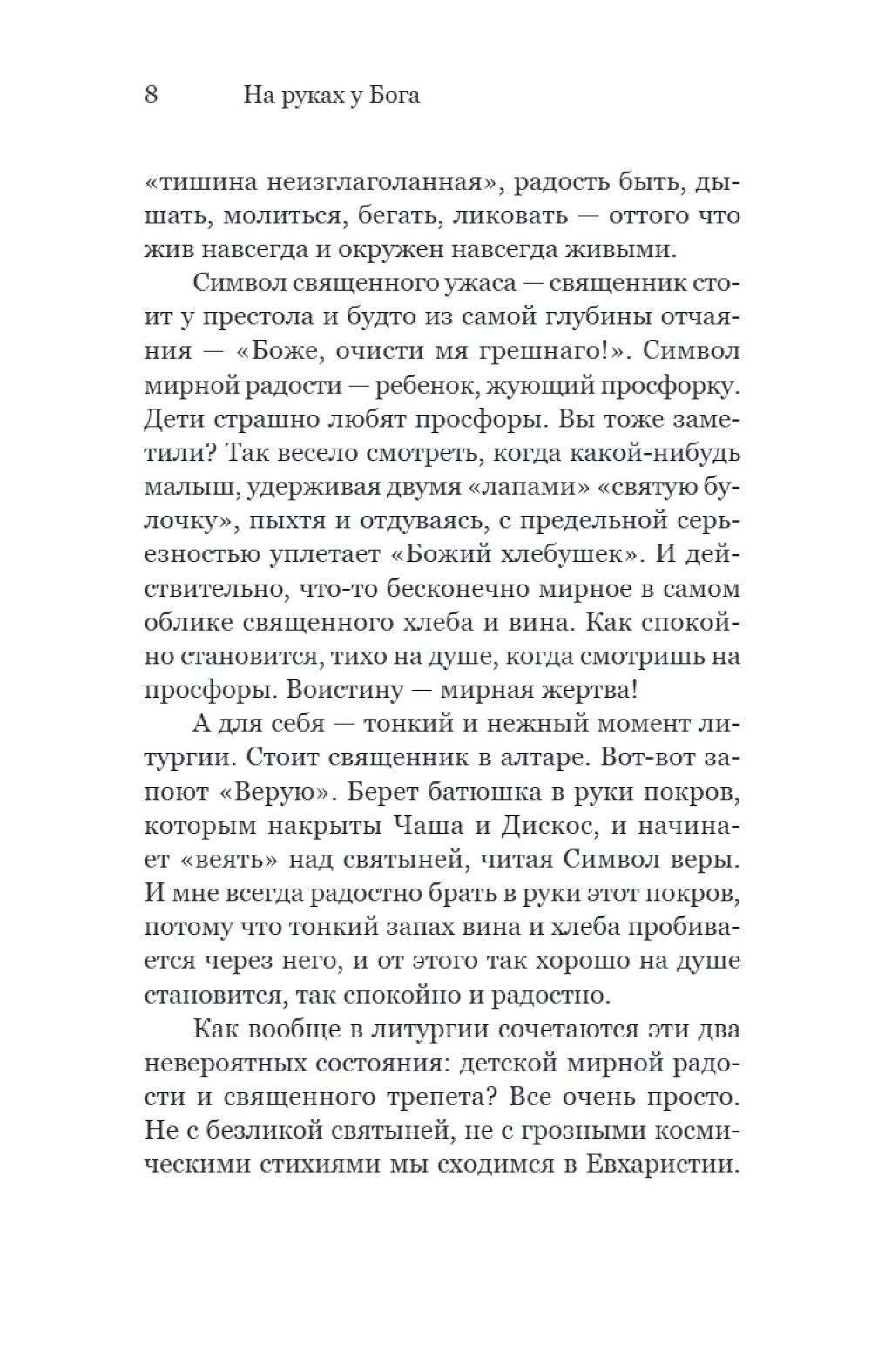 «На руках у Бога» - это книга, которая учит всегда находить радость в православии. Бестселлер от одного из самых популярных авторов сайта «Православие и мир» - архимандрита Саввы (Мажуко). В книге «На руках у Бога. О радости быть христианином» вы найдете: - десятки жизненных историй, которые заставят улыбнуться любого близкого к православию человека - уникальный, одновременно трогательный и жизнерадостный слог отца Саввы - россыпь коротких и ярких эссе с вкраплениями воспоминаний автора - ответы на волнующие всех бытовые и глубоко философские вопросы| Издательство | Изд. НИКЕЯ |