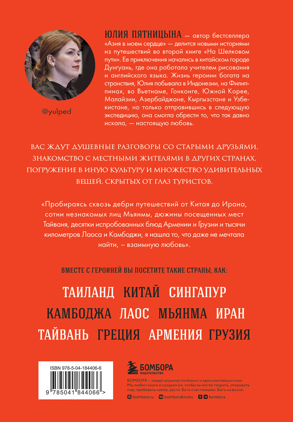 Юлия Пятницына, автор бестселлера «Азия в моем сердце», делится новыми историями из путешествий во второй книге «На шелковом пути». Ее приключения начались в китайском городе Дунгуань, где она работала учителем рисования и английского языка. Жизнь героини богата на странствия, Юлия побывала в Индонезии, на Филиппинах, во Вьетнаме, Гонконге, Южной Корее, Малайзии, Азербайджане, Кыргызстане и Узбекистане, но только отправившись в следующую экспедицию, она смогла обрести то, что так давно искала - настоящую любовь. Вас ждут душевные разговоры со старыми друзьями, знакомство с местными жителями в других странах, погружение в иную культуру и множество удивительных вещей, скрытых от глаз туристов. Вместе с героиней вы посетите такие страны, как: Таиланд, Китай, Сингапур, Камбоджа, Лаос, Мьянма, Иран, Тайвань, Греция и Армения.| Издательство | ООО "Издательство "Эксмо" |