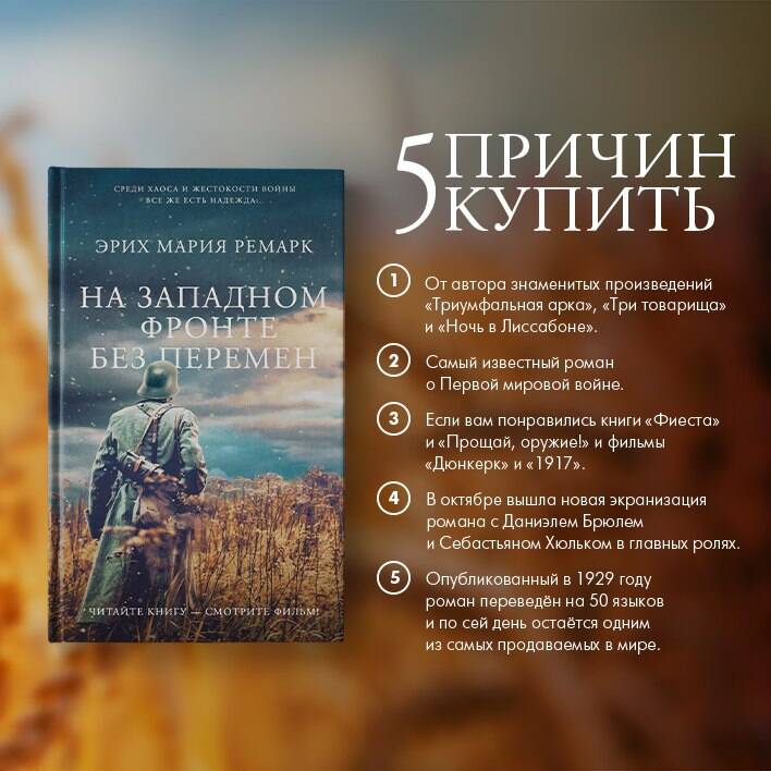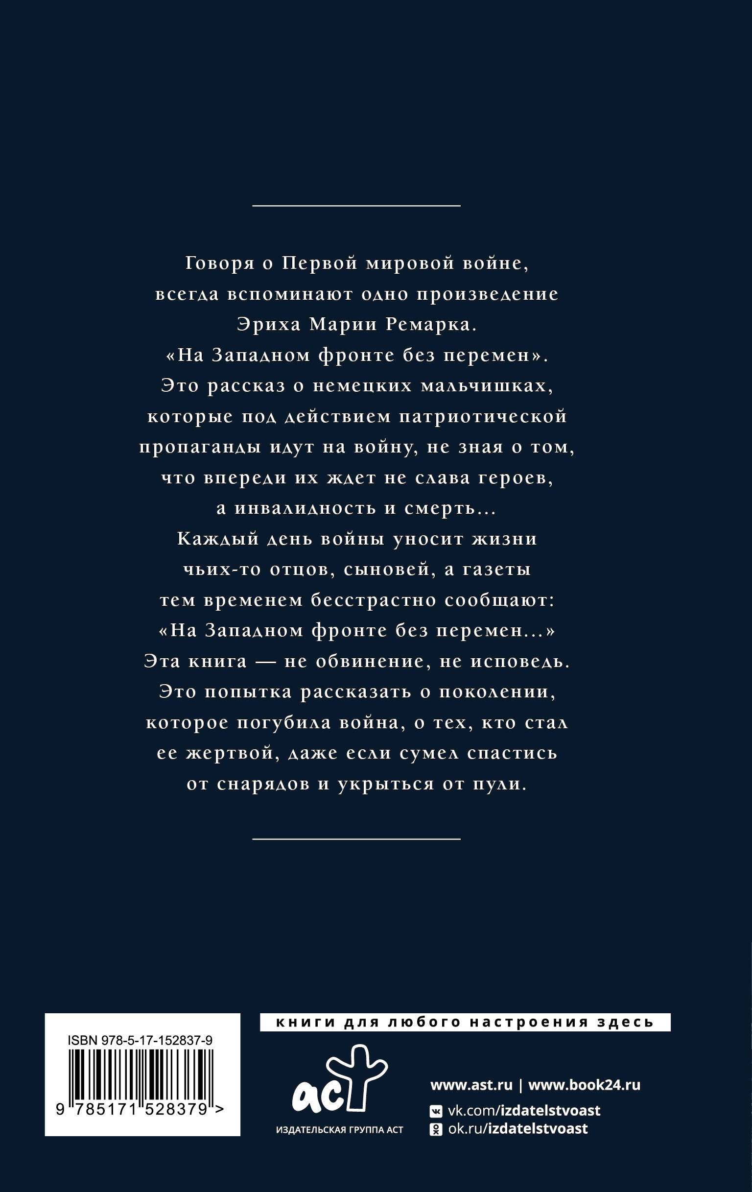 Самый известный роман о Первой мировой войне от автора всемирно известных книг «Триумфальная арка», «Три товарища» и «Ночь в Лиссабоне». В октябре выходит новая экранизация романа, с известными немецкими актерами Даниэлем Брюлем и Себастьяном Хюльком в главных ролях. Читайте книгу, смотрите фильм!