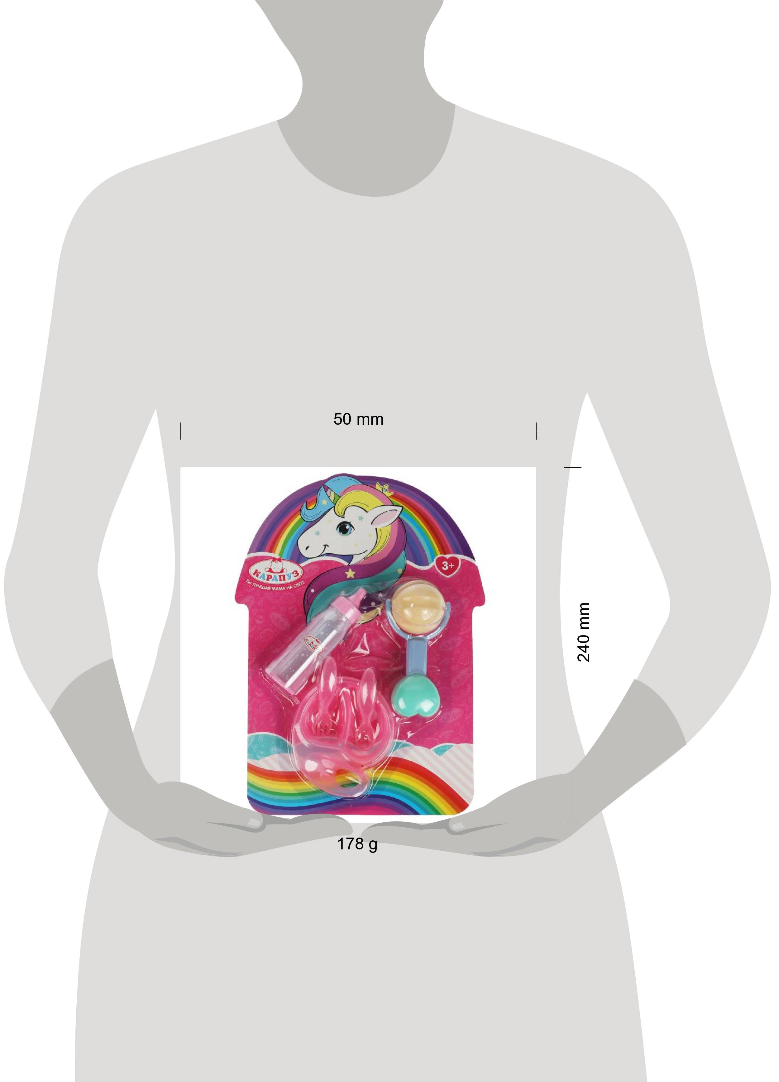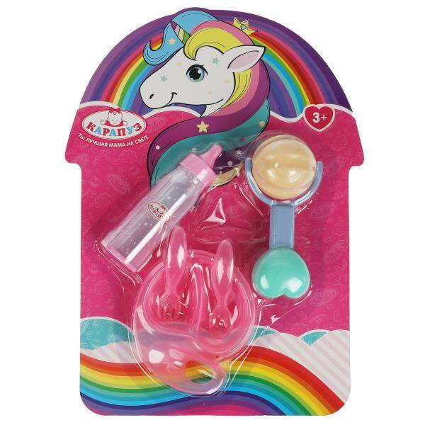 Аннотация: Набор аксессуаров 5 предметов: погремушка, бутылочка, тарелочка, ложка, вилка КАРАПУЗ в кор.2*48шт