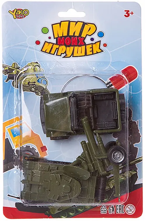 В наборе 5 предметов. Танк и машина инерционные. Пушка - без механизма
