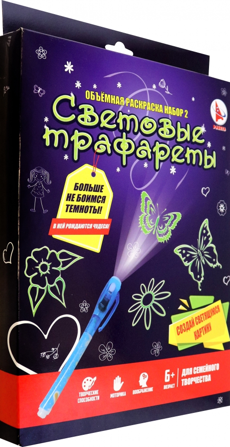 С набором Световые трафареты вы почувствуете себя настоящим волшебником, погрузившись в сказочный мир фантазий и чудес! Создавайте сюжеты и рисуйте картины, светящиеся в темноте, с помощью специального маркера и планшета. Рекомендуемый возраст: 6+. Состав: пластиковая ручка, картонный планшет, 2 картонных трафарета, инструкция. Не предназначено для детей младше 3 лет.