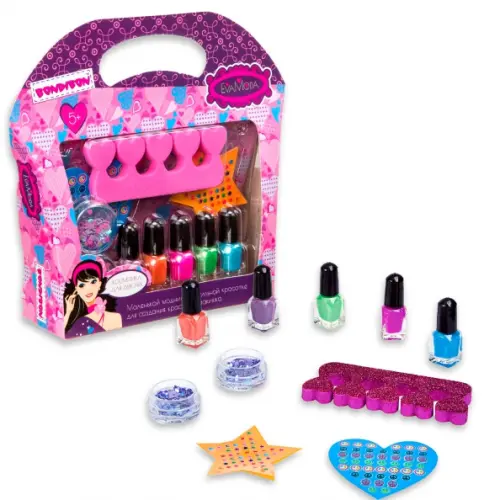 В набор детской декоративной косметики входят BOX 20,6х19 см, лаки для ногтей (5 цветов; 4,5г), украшения для ногтей, разделитель для пальцев.