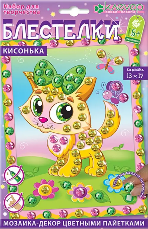 Мини-картины серии "Блестелки" - первые шаги ребёнка в освоении интересной и красочной техники мозаики. Это самый простой пример мозаики - не сплошное составление картины из мелких элементов, а декорирование её отдельных частей. Украсьте картину разноцветными искрящимися пайетками! Без клея - аккуратно и чисто!
