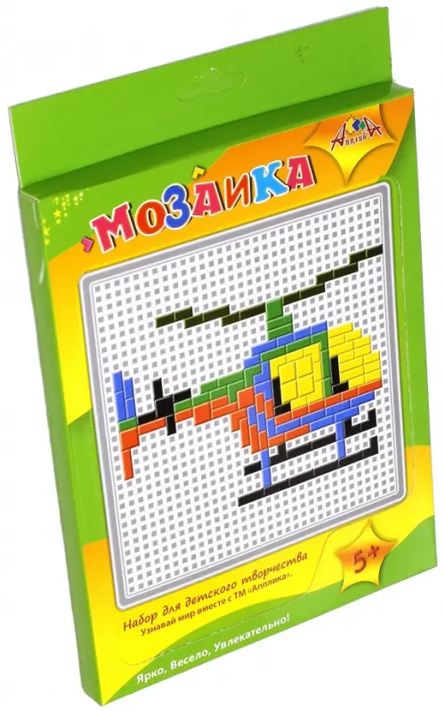 Набор для детского творчества "Мозаика" состоит из основы - пластиковой сетки размером 14х14 см, в которой отверстия для крепления элементов мозаики. Сами элементы из пластика разного цвета имеют форму квадратов, прямоугольников и уголков. С одной стороны они гладкие, с другой имеют ножку, с помощью которой крепятся в ячейки основы. Картонная коробка раздвижная с вкладышем, который используется как шаблон. Можно на нем разместить основу и выкладывать мозаику, а можно по нему отсчитывать клеточки для правильного размещения элементов. В результате получится яркая картинка. Пластиковая основа имеет петельку, за которую можно повесить картинку. В случае ошибки достать элементы из основы поможет специальное приспособление. Набор рассчитан на детей от 5-ти лет, Занятия с помощью этого набора развивают мелкую моторику, внимание, помогают в изучении цвета и формы предметов и начальных шагов счета. Упаковка -картонная коробка с европодвесом.