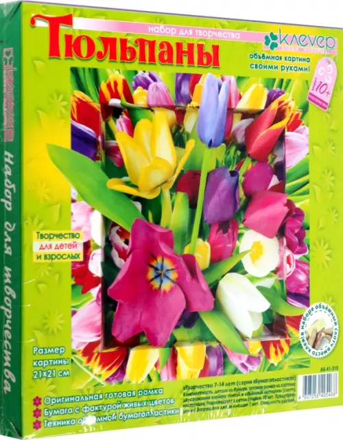 Комплектация: детали из цветной бумаги, готовая рамка из картона, двусторонний тонкий и объёмный скотч, инструкция на обороте упаковки