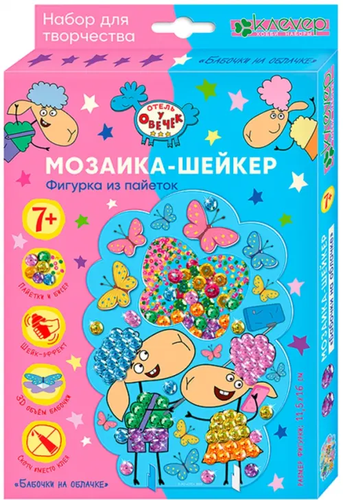 В технике «Мозаика-шейкер» ребёнок старше 7 лет научится делать фигурку-«шейкер» с овечкой Беллой и барашком Беней - любимыми героями мультфильма «Отель у овечек» на фоне облачка с бабочками: из свободно пересыпающихся бисера, пайеток и пластика изготовит окошко «шейкера», заполнит и украсит фрагменты двусторонней фигурки пайетками, наклеит бабочек. Это развивает пространственное воображение, конструкторские способности, творческое воображение и мелкую моторику пальчиков ребёнка, помогает почувствовать себя самостоятельным, приносит радость творчества и отличное настроение. Без клея и гвоздиков - чисто и безопасно!