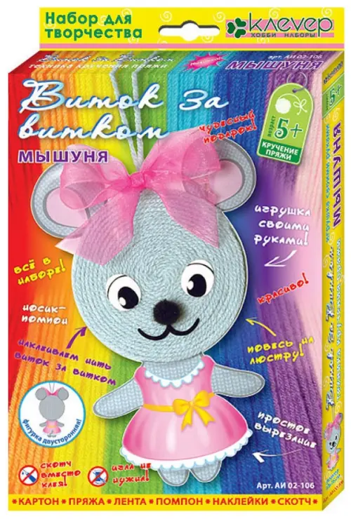 В комплекте: картон цветной, пряжа цветная, лента, помпон, наклейки, двусторонний скотч.
