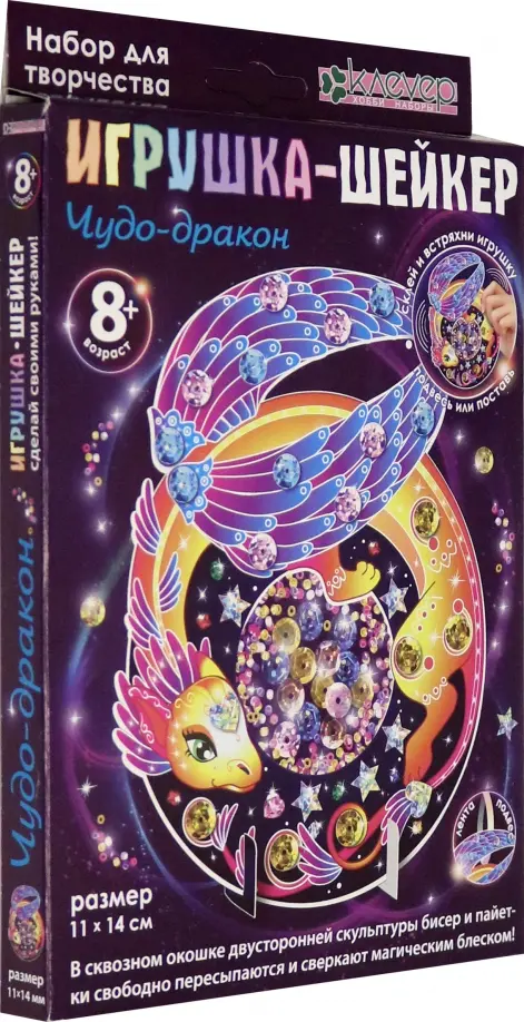 «Чудо-дракон» - искрящаяся фигурка-шейкер (от англ. shake - трясти), уникальная картонная скульптура-украшение. Ребёнок старше 8 лет изготовит «шейкер» из пайеток и бисера, склеит две детали и поместит на подставку или подвесит как украшение. Яркий дракон, парящий на переливающихся крыльях в звёздном вихре млечного пути, декорированный голографическими стикерами и блестящими пайетками, - это сверкающее чудо, сделанное своими руками!