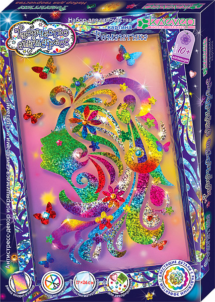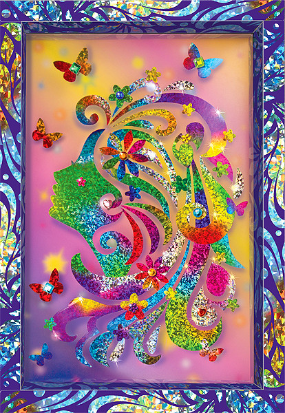 Техника "антистресс-декорирование стикерами" помогает по схеме или по своему вкусу послойно заполнять пространство полупрозрачного матированного пластика фигурными сверкающими элементами и "ювелирными" стразами, постепенно "проявляя" сказочный рисунок - романтичный профиль девушки с изящными волнами локонов, которых коснулось лёгкое дуновение ветерка; яркие цветы и порхающие бабочки дополняют вдохновенный образ. Основа из пластика вставляется в готовую красочную рамку, создавая эффект невесомости искрящегося рисунка. Увлекательное занятие захватывает внимание, приносит с собой радость творчества и отличное настроение!