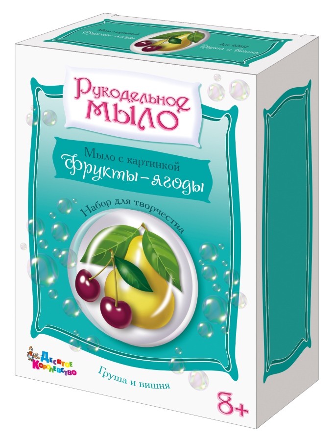 При помощи этого набора для творчества ребенок своими собственными руками сможет создать красивый кусочек мыла с картинкой груши и вишни. Для этого потребуется внимание, ответственность и соблюдение инструкции, что вполне по силам детям от 8-ми лет и старше. Единственным ограничением является контроль и помощь со стороны взрослых при нагреве и манипуляциях с горячей мыльной основой.