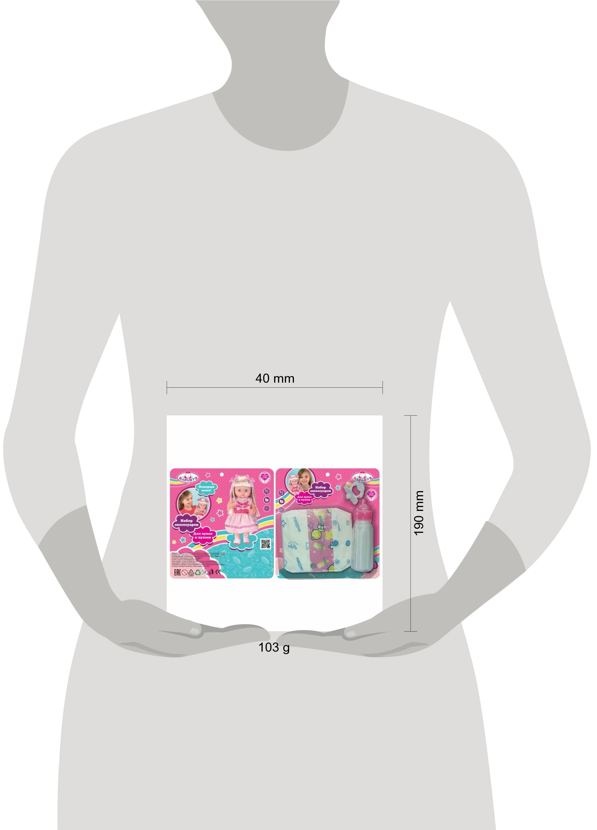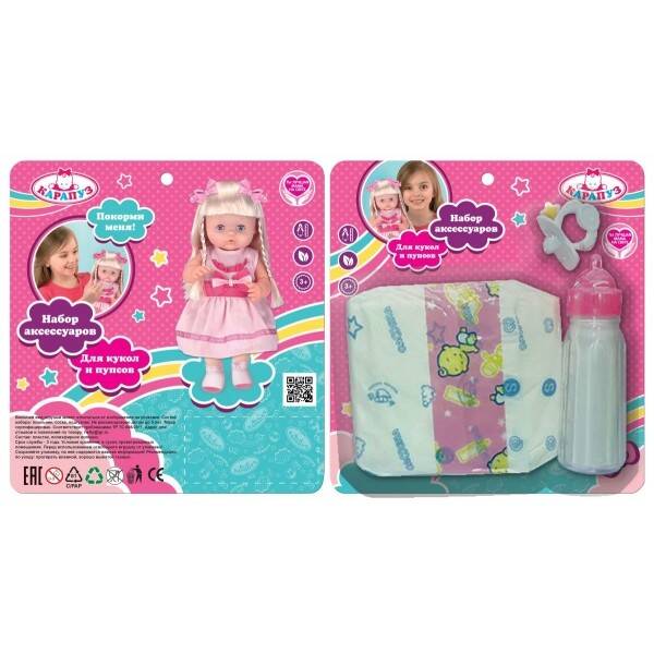 Набор включает: - памперс; - бутылочка; - соска. Все пупсы и куклы нуждаются в уходе и заботе, как настоящие дети. Набор можно использовать в сюжетно-ролевых играх с пупсом или куклой: - дать соску; - поменять памперс; - покормить из бутылочки... дальше ". Такие игры помогают детям освоить новые социальные роли и развить воображение. Набор подходит для кукол и пупсов ростом 40-46 см.| Издательство | СИМБАТ ООО |
