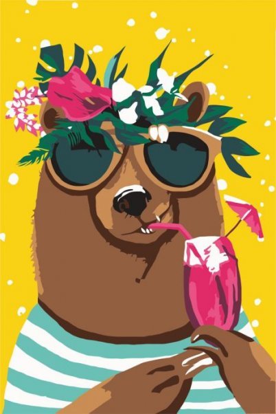 Набор для раскрашивания по номерам Медведь с коктейлем, 12 цветов: краски акриловые на водной основе 12 штук, холст c контурным рисунком (нетканый материал), на подрамнике из МДФ, кисти 2 штуки, контрольный лист со схемой. / 20x30x1,6см арт.88098