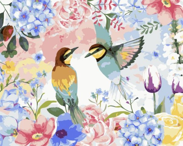Набор для раскрашивания по номерам Птицы и цветы, 24 цвета: краски акриловые на водной основе 24 штуки, холст c контурным рисунком (нетканый материал), на подрамнике из МДФ, кисти 3 штуки, контрольный лист со схемой / 40x50x1,6см арт.88123
