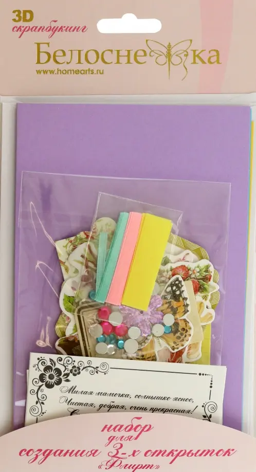 Наборы комплектуются цветными заготовками для открыток, ленточками, тесьмой и стразами разных форм. В каждый набор вложен комплект вырубки из картона - это красивые букеты, бабочки, карточки для надписей, рамки, игрушки, звездочки, воздушные шары и многое другое. В зависимости от модели вырубка будет разная. Еще одна отличительная особенность этих наборов на внутренней стороне вкладыша напечатаны карточки для скрапбукинга их можно вырезать и использовать при создании своей композиции.