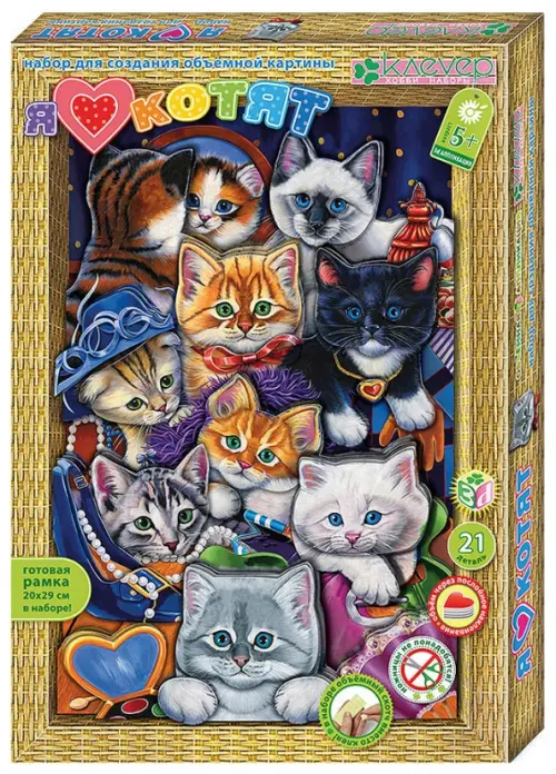 Красочная картина "Я люблю котят" ребёнок старше 5 лет с помощью взрослых сможет сделать сам - без клея и ножниц, в технике 3-D аппликации. Персонажи картины - милые котята, которые решили "навести порядок" среди украшений своей хозяйки. Работая с набором, ребёнок учится складывать трёхмерное изображение из частей, составляя перспективу. Рамку собирать не нужно - красочная и глубокая готовая рамка входит в набор. Клей также не нужен - вместо него в наборе объёмный двусторонний скотч.