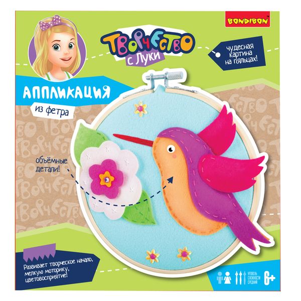 В наборе: яркие заготовки из фетра, пяльца из бамбука, нити мулине, наперсток, игла, аксессуары для украшения, инструкция со схемой работы.