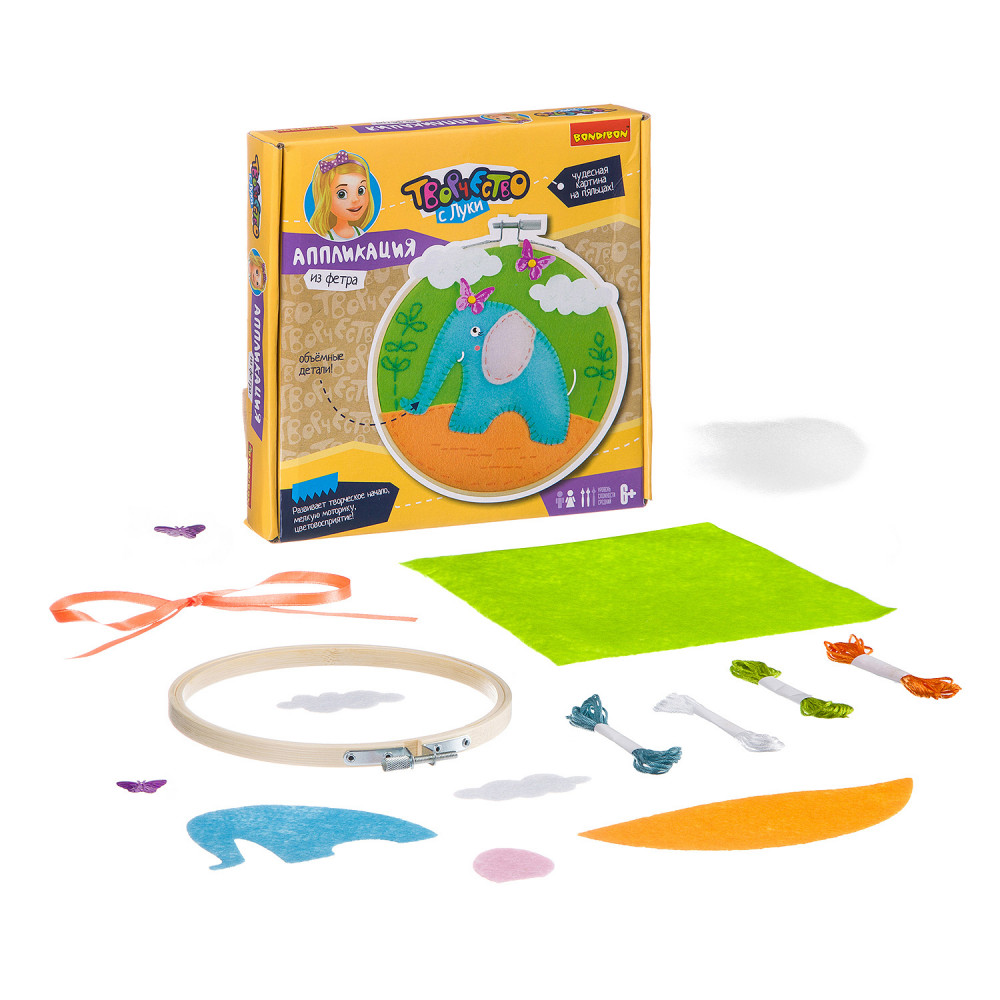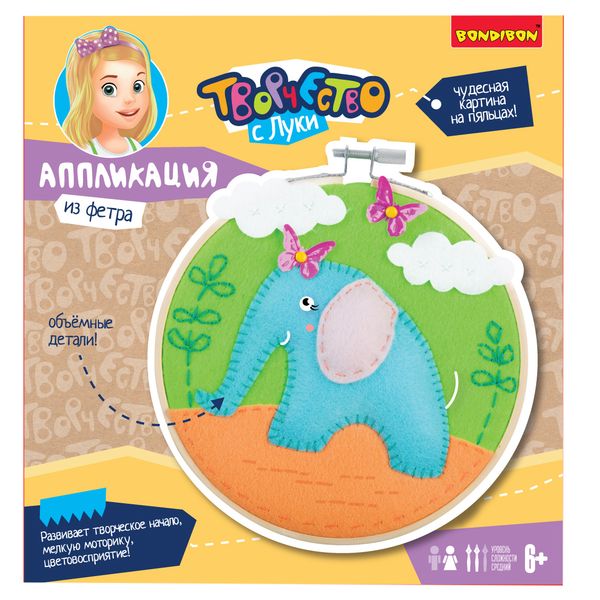 В наборе: яркие заготовки из фетра, пяльца из бамбука, нити мулине, наперсток, игла, аксессуары для украшения, инструкция со схемой работы.