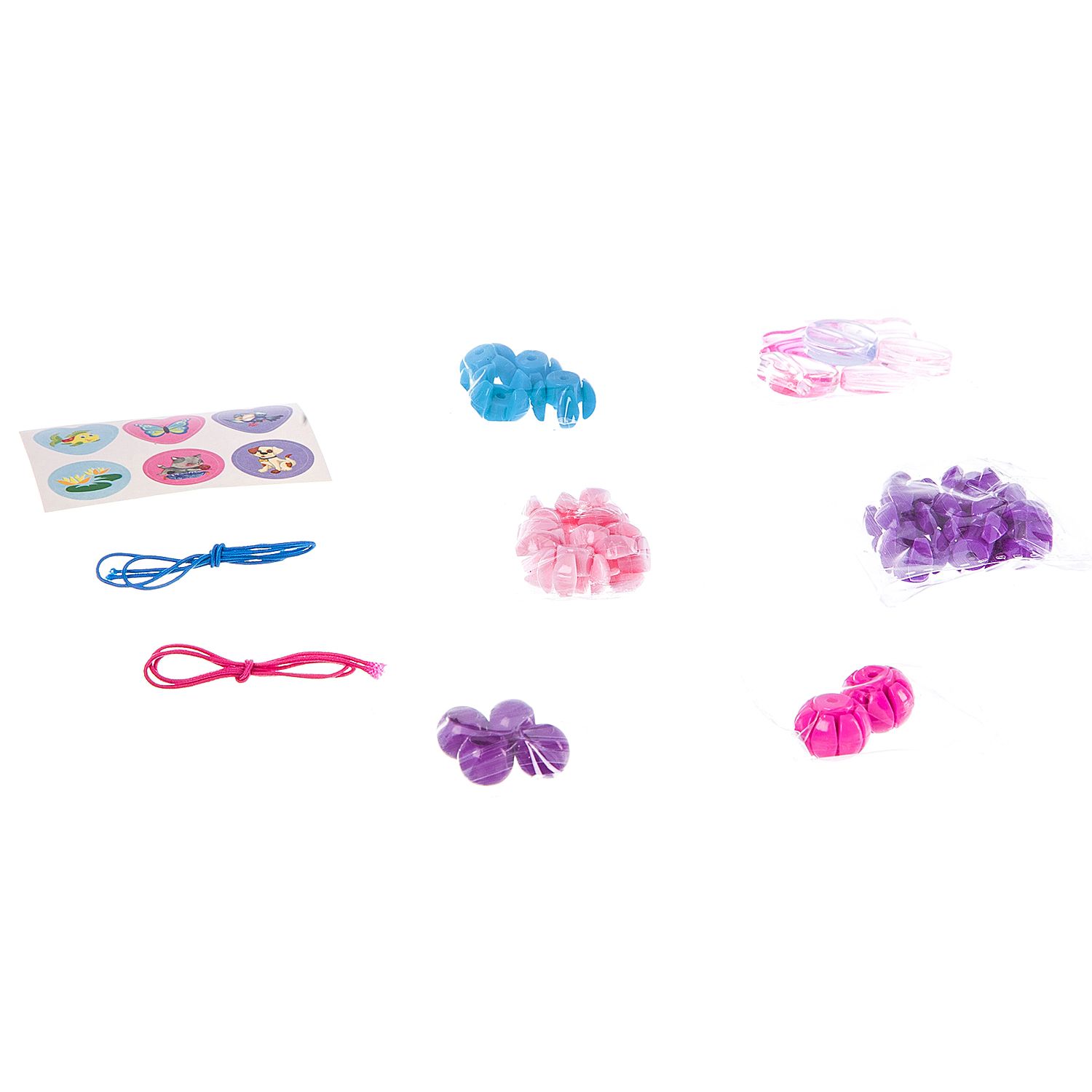 Состав набора: пластиковые бусы в ассортименте, эластичные нити, лист с наклейками, инструкция.