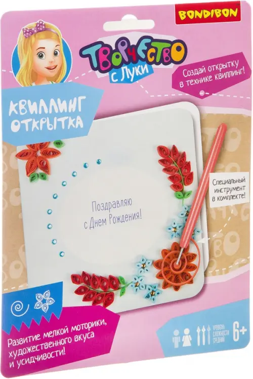 Квиллинг или бумагокручение увлекательный вид творчества по изготовлению плоских или объёмных композиций из скрученных в спиральки длинных и узких полосок бумаги. С помощью специального инструмента для кручения в комплекте ваш ребенок создаст замечательную открытку, состоящую из различных элементов и форм. При скручивании и склеивании мелких деталей развивается внимательность и аккуратность.