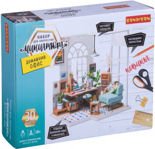 Румбокс - новый, стремительно набирающий популярность в мире, вид хобби. Он представляет собой создание трехмерного интерьера в миниатюре. Когда-то им занимались только дизайнеры, а теперь он стал доступен всем - и взрослым, и детям. Это прекрасное увлечение поможет не только интересно провести время, но и поспособствует развитию пространственного мышления, фантазии, тренировке мелкой моторики, координации и усидчивости. В составе набора имеется всё необходимое для сборки. Детали пронумерованы и разложены по пакетам. К набору прилагается иллюстрированная пошаговая инструкция. Создайте интерьер настоящего домашнего офиса с потрясающей детализацией предметов и настоящим освещением.