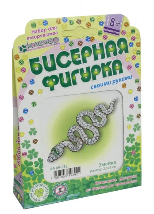 Набор «Змейка» предлагает создать из бисера и проволоки серебристую брошь-змейку с красивыми изгибами и «изумрудными» глазками. Такое украшение будет отлично смотреться на лацкане пиджака или на берете, а если приподнести его в подарок, станет талисманом, приносящим удачу!