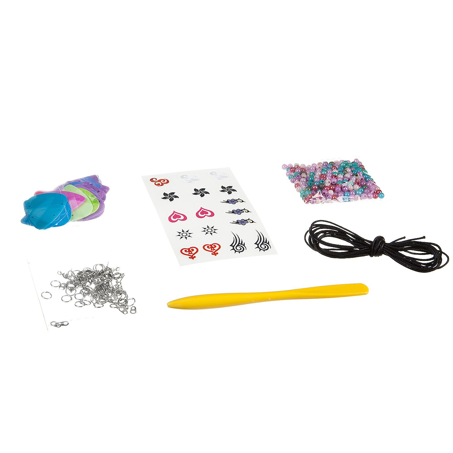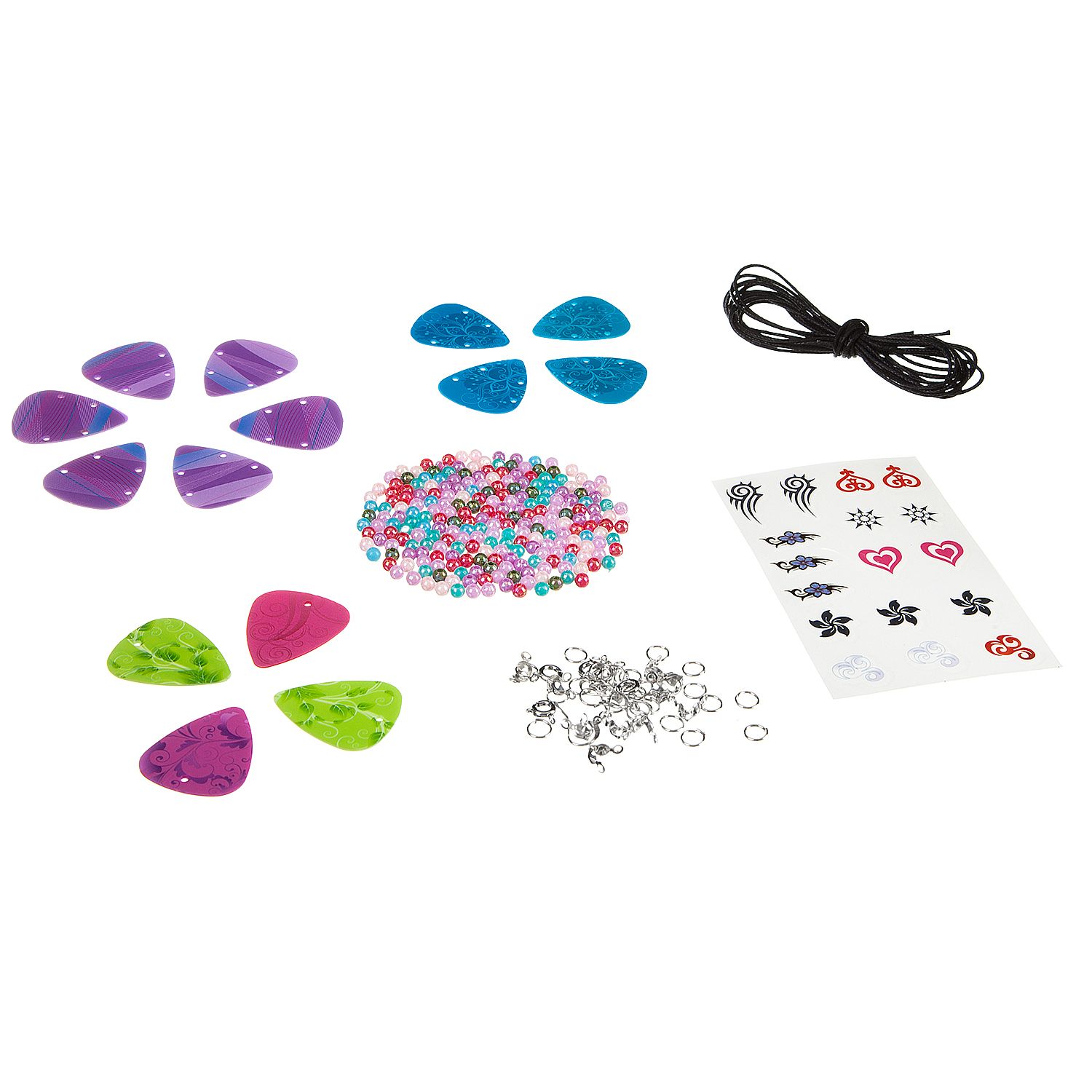 Состав набора: медиаторы из пластика, вощеный шнурок, наклейки, палочка для нанесения наклеек, пластиковые бусы в ассортименте, металлические аксессуары для создания украшений в ассортименте, инструкция.