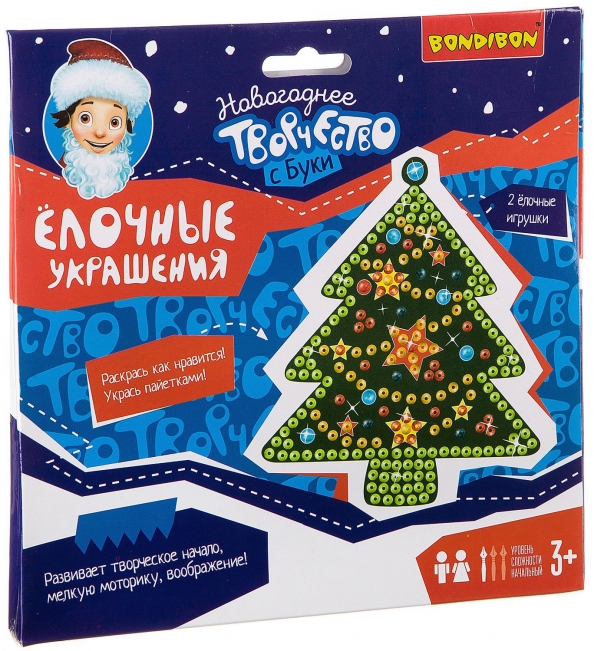 Новогодний, увлекательный набор для детского творчества! Как приятно украсить праздничную ёлочку поделками созданными своими руками! С таким чудесным набором ребёнок сам сможет смастерить из заготовок, входящих в набор, нарядную ёлочку или забавного деда Мороза. Для этого необходимо раскрасить бумажные заготовки из набора по собственному вкусу, и украсить их цветными пайетками с помощью клея. Вот и всё! Готовые украшения можно вешать на ёлочку!